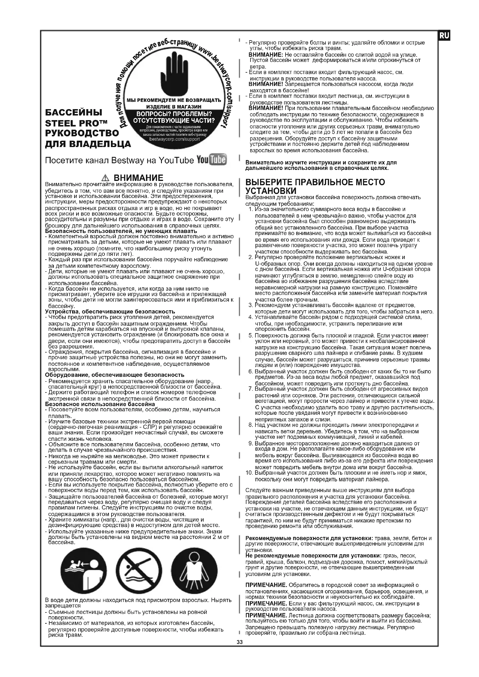 STEEL PRO™ РУКОВОДСТВО ДЛЯ ВЛАДЕЛЬЦА - Регулярно проверяйте болты и винты; удаляйте обломки и острые углы, чтобы избежать риска травм. ВНИМАНИЕ: Не оставляйте бассейн со слитой водой на улице. Пустой бассейн может деформироваться и/или опрокинуться от ветра.- Если в комплект поставки входит фильтрующий насос, см. инструкции в руководстве пользователя насоса. ВНИМАНИЕ! Запрещается пользоваться насосом, когда люди находятся в бассейне!- Если в комплект поставки входит лестница, см. инструкции в руководстве пользователя лестницы. ВНИМАНИЕ! При пользовании плавательным бассейном необходимо соблюдать инструкции по технике безопасности, содержащиеся в руководстве по эксплуатации и обслуживанию. Чтобы избежать опасности утопления или других серьезных травм, внимательно следите за тем, чтобы дети до 5 лет не попали в бассейн без разрешения. Оборудуйте доступ к бассейну защитными устройствами и постоянно держите детей под наблюдением взрослых во время использования бассейна. Внимательно изучите инструкции и сохраните их для дальнейшего использования в справочных целях. ВЫБЕРИТЕ ПРАВИЛЬНОЕ МЕСТО