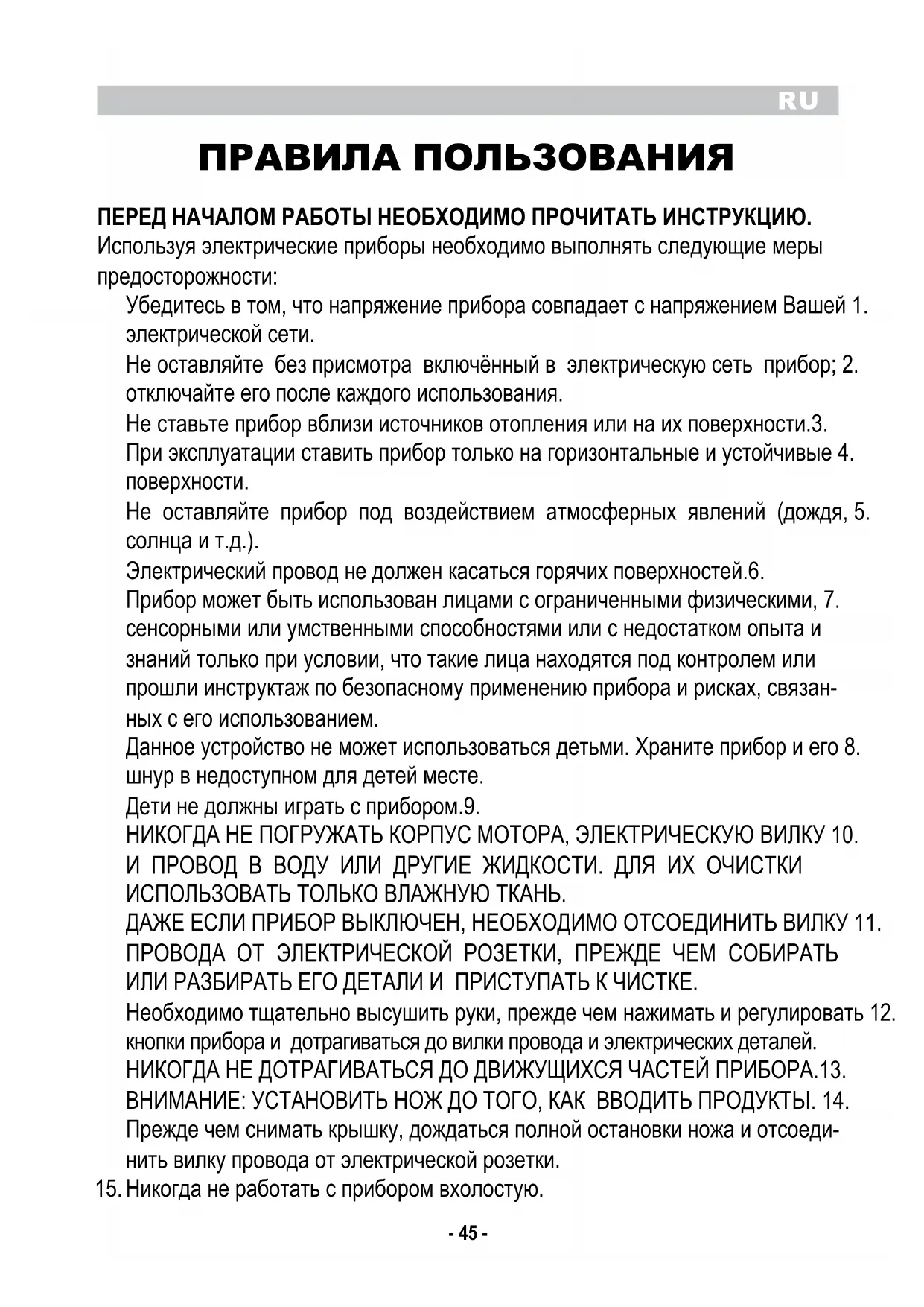 ПРАВИЛА ПОЛЬЗОВАНИЯ ПЕРЕД НАЧАЛОМ РАБОТЫ НЕОБХОДИМО ПРОЧИТАТЬ ИНСТРУкЦИЮ. Используя электрические приборы необходимо выполнять следующие меры предосторожности: Убедитесь в том, что напряжение прибора совпадает с напряжением Вашей 1. электрической сети. Не оставляйте без присмотра включённый в электрическую сеть прибор; 2. отключайте его после каждого использования. Не ставьте прибор вблизи источников отопления или на их поверхности.3. При эксплуатации ставить прибор только на горизонтальные и устойчивые 4. поверхности. Не оставляйте прибор под воздействием атмосферных явлений (дождя, 5. солнца и т.д.). Электрический провод не должен касаться горячих поверхностей.6. Прибор может быть использован лицами с ограниченными физическими, 7. сенсорными или умственными способностями или с недостатком опыта и знаний только при условии, что такие лица находятся под контролем или прошли инструктаж по безопасному применению прибора и рисках, связан- ных с его использованием. Данное устройство не может использоваться детьми. Храните прибор и его 8. шнур в недоступном для детей месте. Дети не должны играть с прибором.9. НИКОГДА НЕ ПОГРУЖАТЬ КОРПУС МОТОРА, ЭЛЕКТРИЧЕСКУЮ ВИЛКУ 10. И ПРОВОД В ВОДУ ИЛИ ДРУГИЕ ЖИДКОСТИ. ДЛЯ ИХ ОЧИСТКИ ИСПОЛЬЗОВАТЬ ТОЛЬКО ВЛАЖНУЮ ТКАНЬ. ДАЖЕ ЕСЛИ ПРИБОР ВЫКЛЮЧЕН, НЕОБХОДИМО ОТСОЕДИНИТЬ ВИЛКУ 11. ПРОВОДА ОТ ЭЛЕКТРИЧЕСКОЙ РОЗЕТКИ, ПРЕЖДЕ ЧЕМ СОБИРАТЬ ИЛИ РАЗБИРАТЬ ЕГО ДЕТАЛИ И ПРИСТУПАТЬ К ЧИСТКЕ. Необходимо тщательно высушить руки, прежде чем нажимать и регулировать 12. кнопки прибора и дотрагиваться до вилки провода и электрических деталей. НИКОГДА НЕ ДОТРАГИВАТЬСЯ ДО ДВИЖУЩИХСЯ ЧАСТЕЙ ПРИБОРА.13. ВНИМАНИЕ: УСТАНОВИТЬ НОЖ ДО ТОГО, КАК ВВОДИТЬ ПРОДУКТЫ. 14. Прежде чем снимать крышку, дождаться полной остановки ножа и отсоеди- нить вилку провода от электрической розетки. Никогда не работать с прибором вхолостую.15.RU