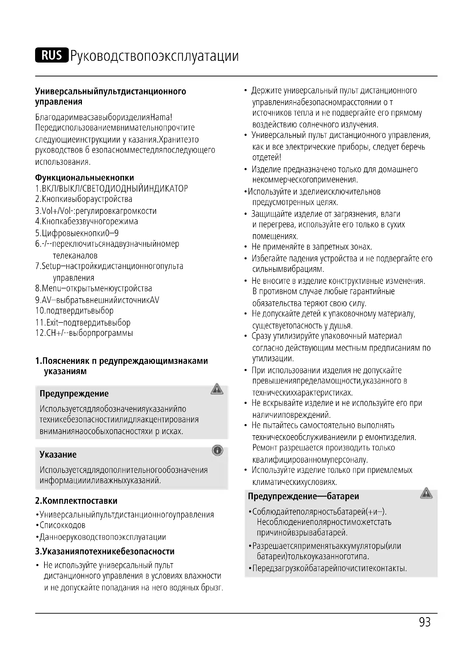 - Универсальныйпульт дистанционного управления, как ивсе электрические приборы, следуетберечь