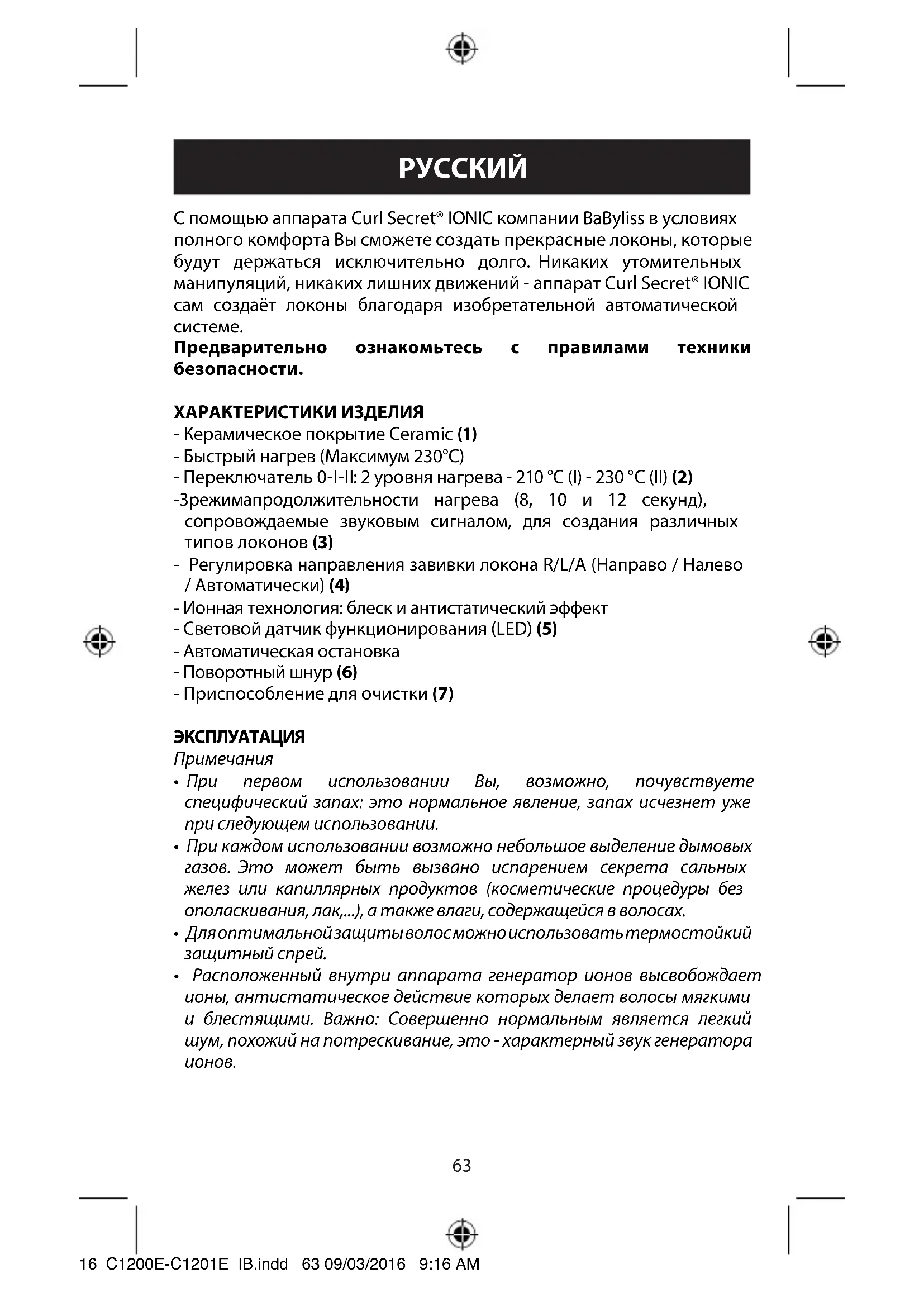 Предварительно ознакомьтесь с правилами техники безопасности. ХАРАКТЕРИСТИКИ ИЗДЕЛИЯ - Керамическое покрытие Ceramic (1) - Быстрый нагрев (Максимум 230°C) - Переключатель 0-I-II: 2 уровня нагрева - 210 °C (I) - 230 °C (II) (2) - 3 режима продолжительности нагрева (8, 10 и 12 секунд), сопровождаемые звуковым сигналом, для создания различных типов локонов (3) - Регулировка направления завивки локона R/L/A (Направо / Налево / Автоматически) (4) - Ионная технология: блеск и антистатический эффект - Световой датчик функционирования (LED) (5) - Автоматическая остановка - Поворотный шнур (6) - Приспособление для очистки (7) ЭКСПЛУАТАЦИЯ