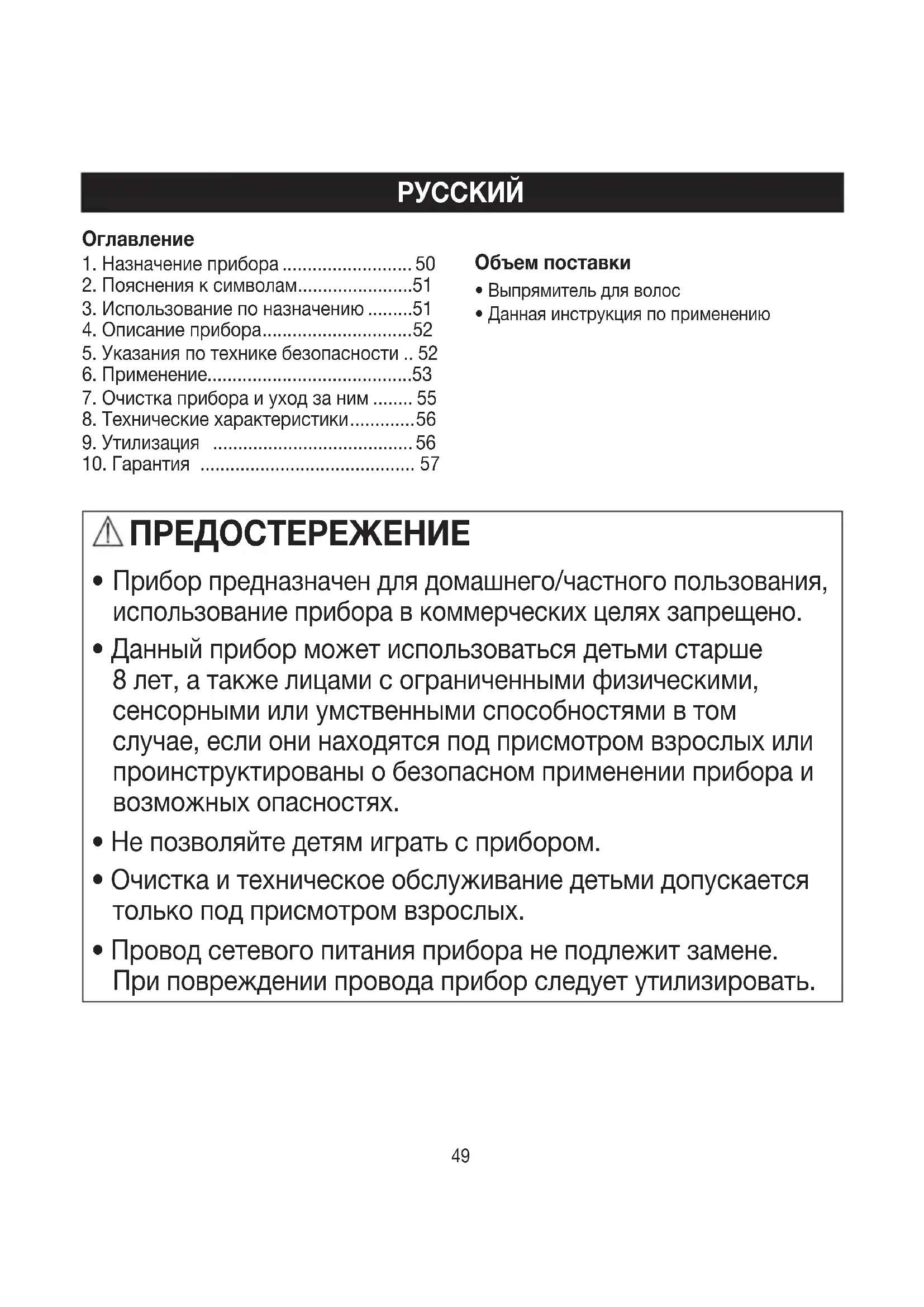 Выпрямитель для волос предназначен для личного пользования – только для распрямления волос и придания им формы! Предостережение Используйте прибор исключительно для следующих целей: