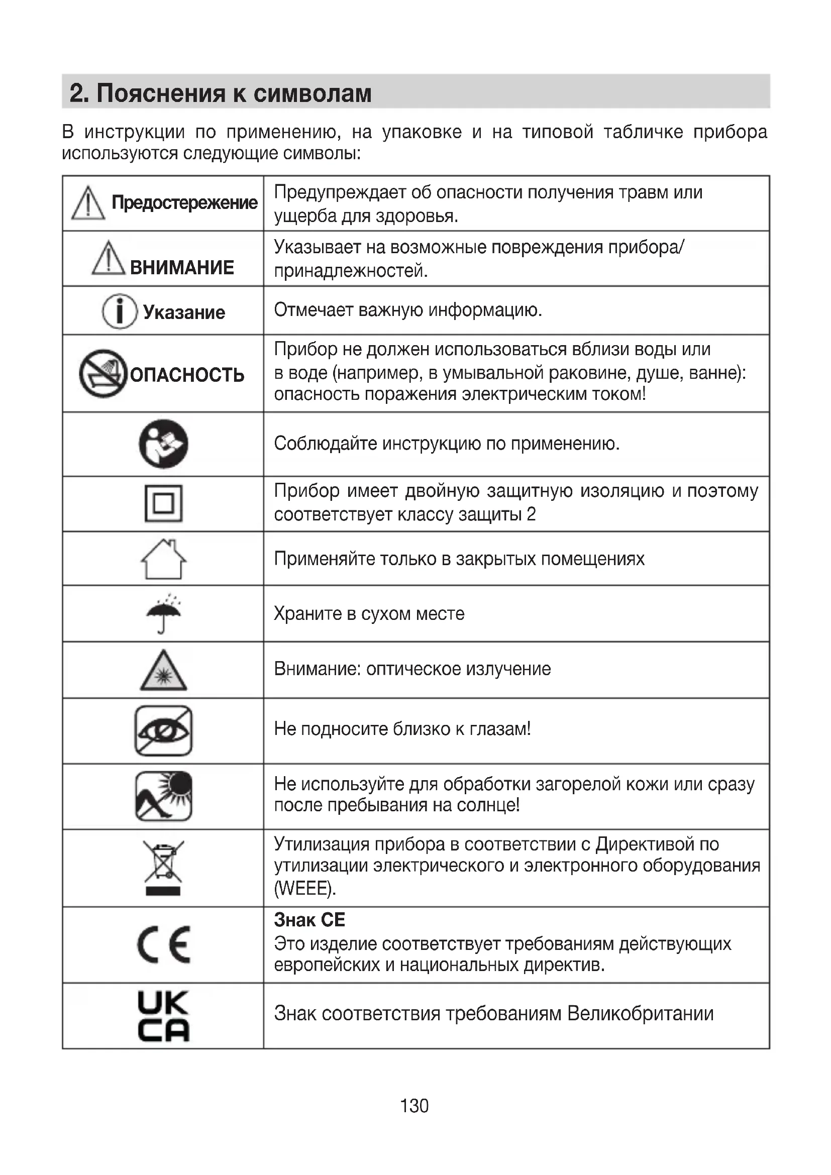 Прибор не должен использоваться вблизи воды или вводе (например, вумывальной раковине, душе, ванне): опасность поражения электрическим током! Соблюдайте инструкцию по применению. Прибор имеет двойную защитную изоляцию ипоэтому соответствует классу защиты2 Применяйте только взакрытых помещениях Храните всухом месте Внимание: оптическое излучение Не подносите близко кглазам! Не используйте для обработки загорелой кожи или сразу после пребывания на солнце! Утилизация прибора всоответствии сДирективой по утилизации электрического иэлектронного оборудования (WEEE).