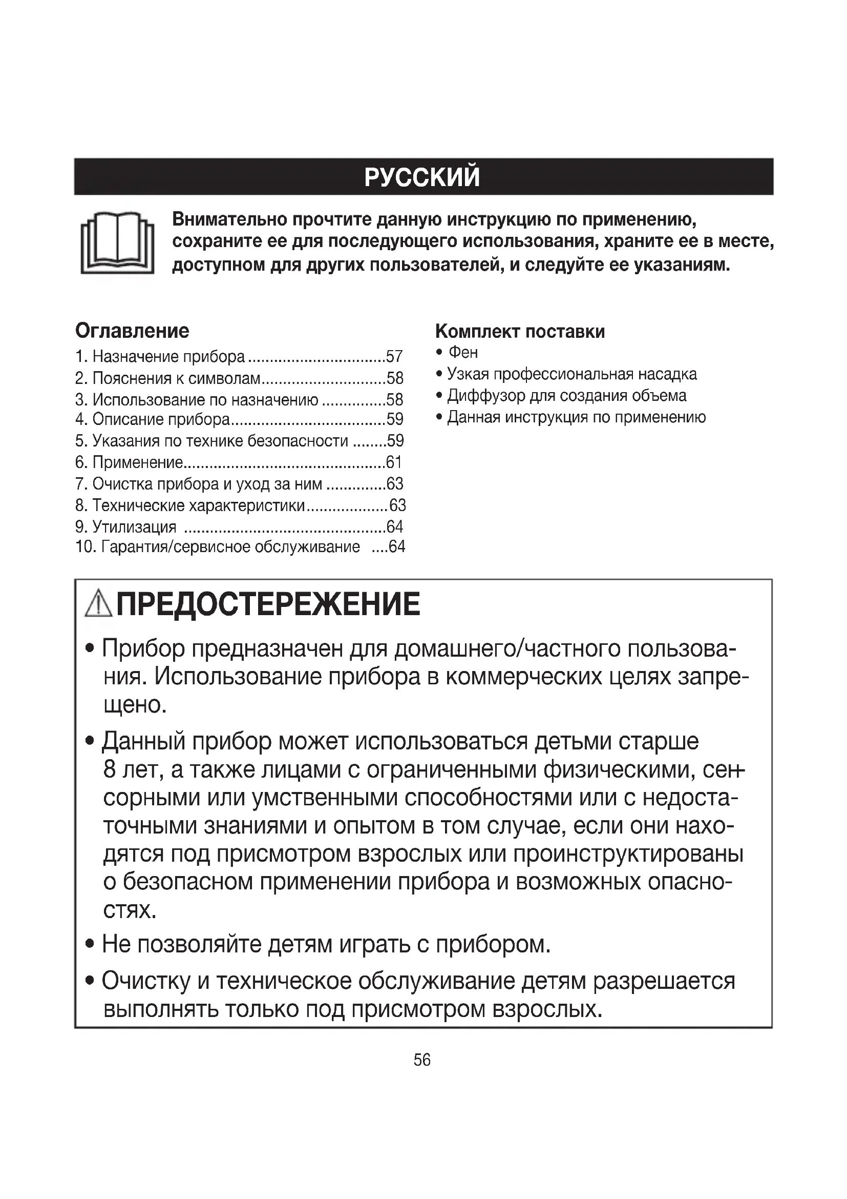 Фен предназначен для сушки ипрофессионального стайлинга волос! Предостережение Используйте прибор исключительно вследующих целях: