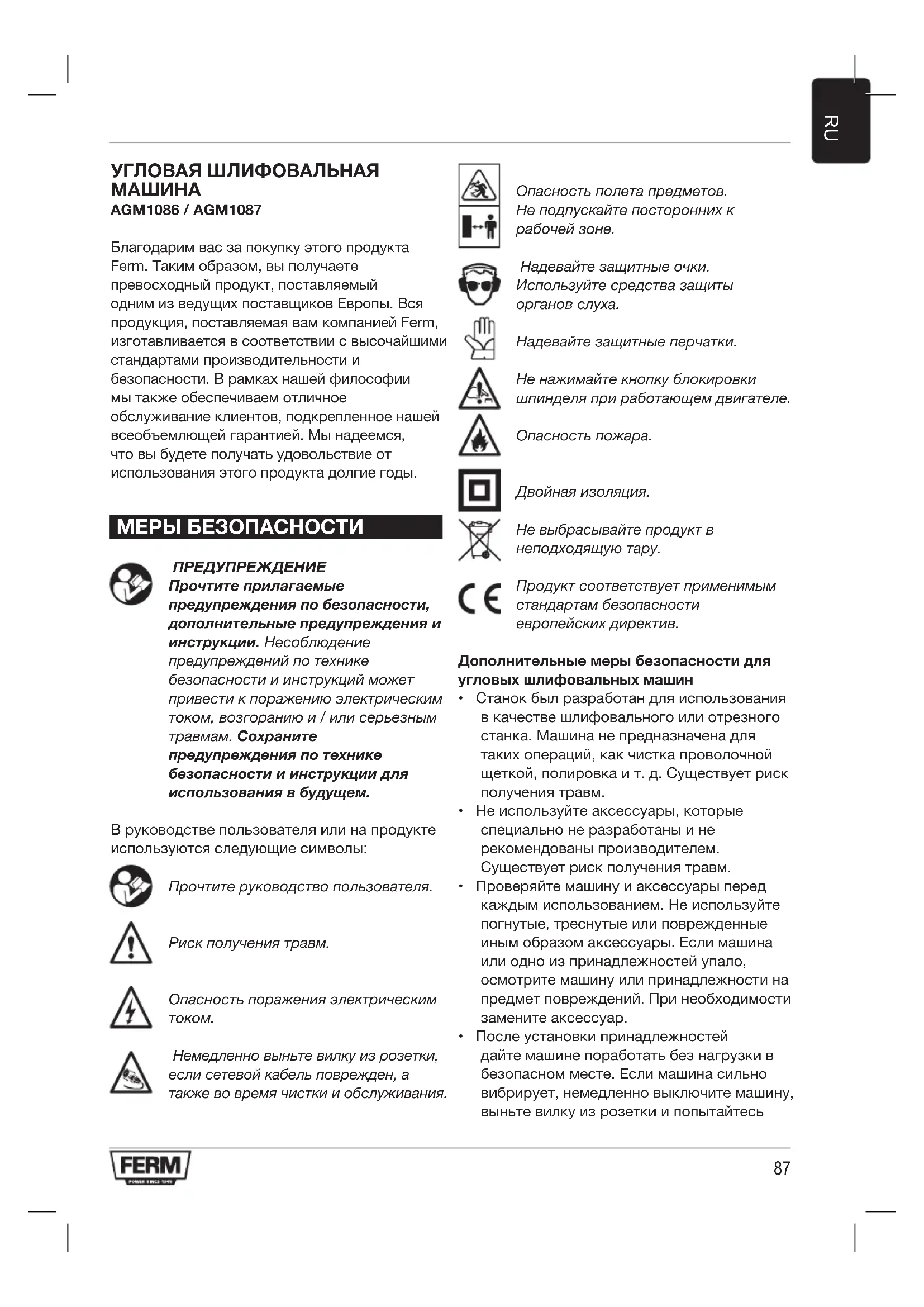 AGM1086 / AGM1087 Благодарим вас за покупку этого продукта Ferm. Таким образом, вы получаете превосходный продукт, поставляемый одним из ведущих поставщиков Европы. Вся продукция, поставляемая вам компанией Ferm, изготавливается в соответствии с высочайшими стандартами производительности и безопасности. В рамках нашей философии мы также обеспечиваем отличное обслуживание клиентов, подкрепленное нашей всеобъемлющей гарантией. Мы надеемся, что вы будете получать удовольствие от использования этого продукта долгие годы. МЕРЫ БЕЗОПАСНОСТИ ПРЕДУПРЕЖДЕНИЕ Прочтите прилагаемые предупреждения по безопасности, дополнительные предупреждения и инструкции. Несоблюдение предупреждений по технике безопасности и инструкций может привести к поражению электрическим током, возгоранию и / или серьезным травмам. Сохраните предупреждения по технике безопасности и инструкции для использования в будущем. В руководстве пользователя или на продукте используются следующие символы: Прочтите руководство пользователя. Риск получения травм. Опасность поражения электрическим