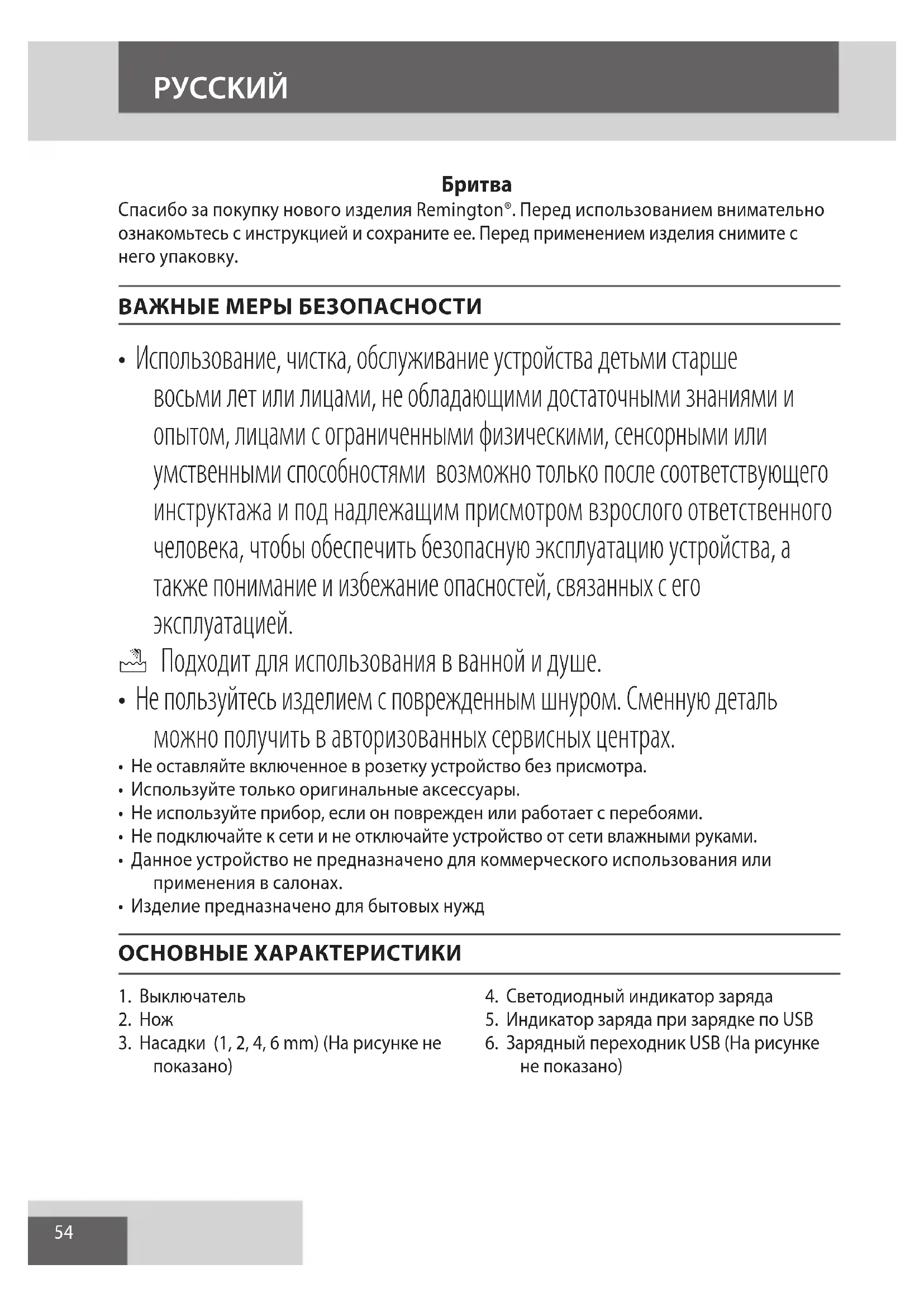 Спасибо за покупку нового изделия Remington®. Перед использованием внимательно ознакомьтесь с инструкцией и сохраните ее. Перед применением изделия снимите с него упаковку. ВАЖНЫЕ МЕРЫ БЕЗОПАСНОСТИ