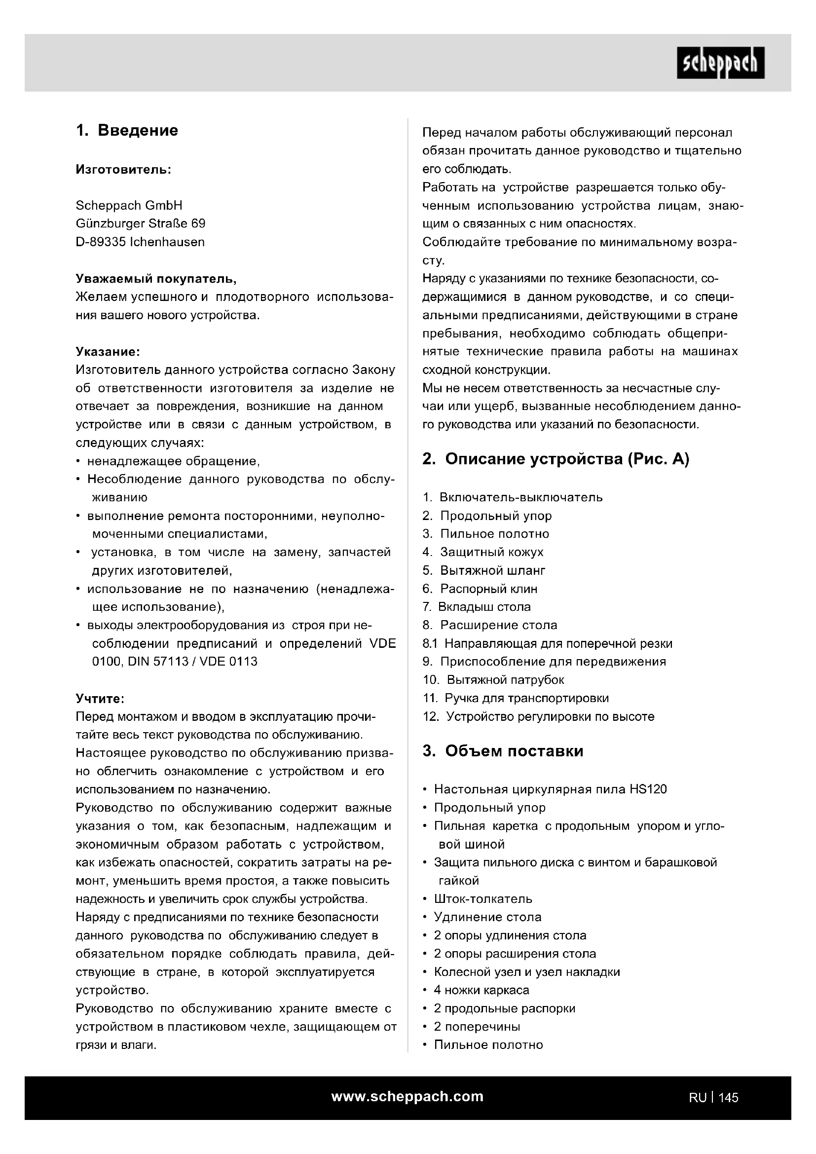Изготовитель: Scheppach GmbH Günzburger Straße 69 D-89335 Ichenhausen Уважаемый покупатель, Желаем успешного и плодотворного использова- ния вашего нового устройства.