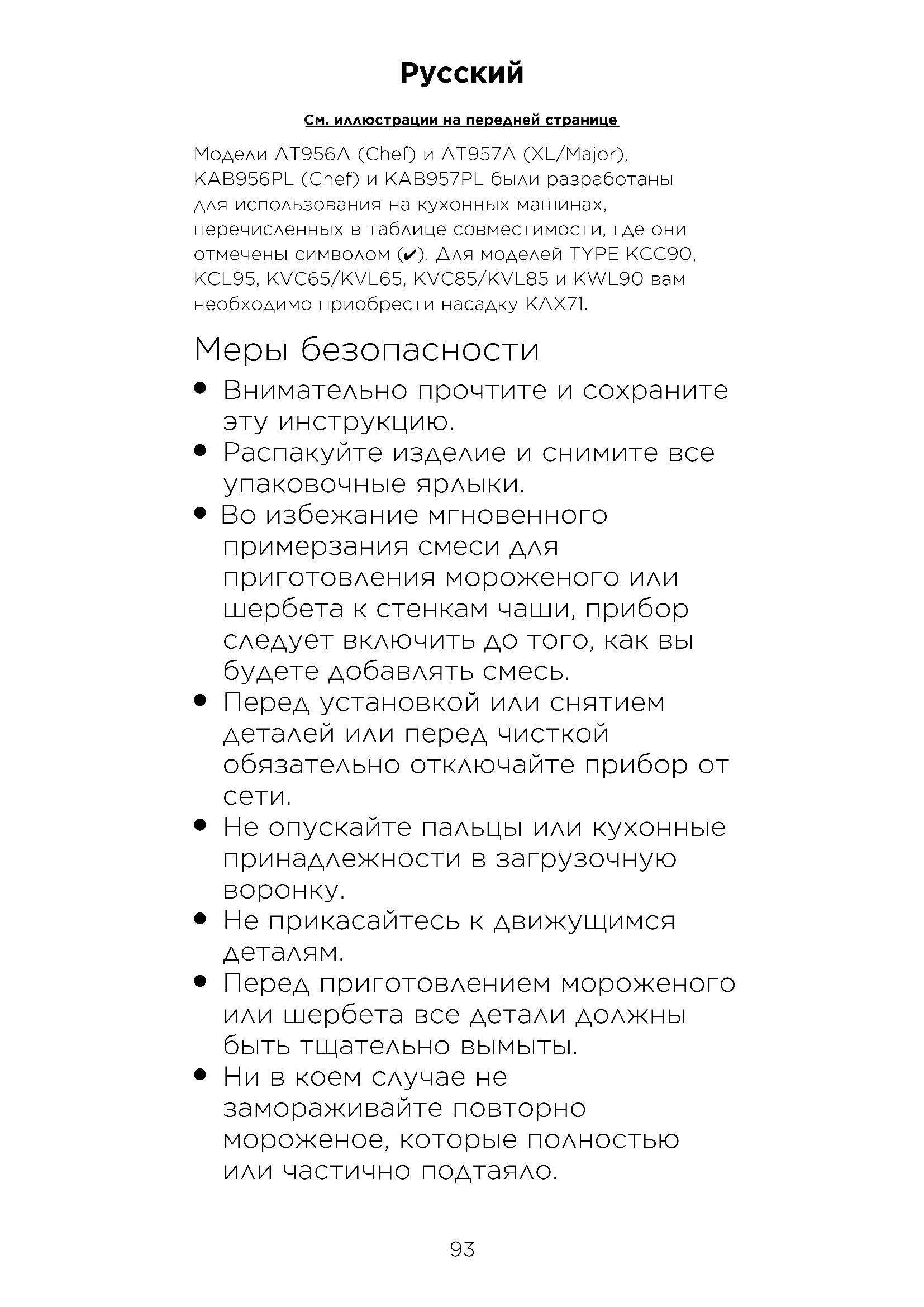 Ознакомьтесь с дополнительными мерами безопасности, которые содержатся в основной инструкции к кухонной машине.95