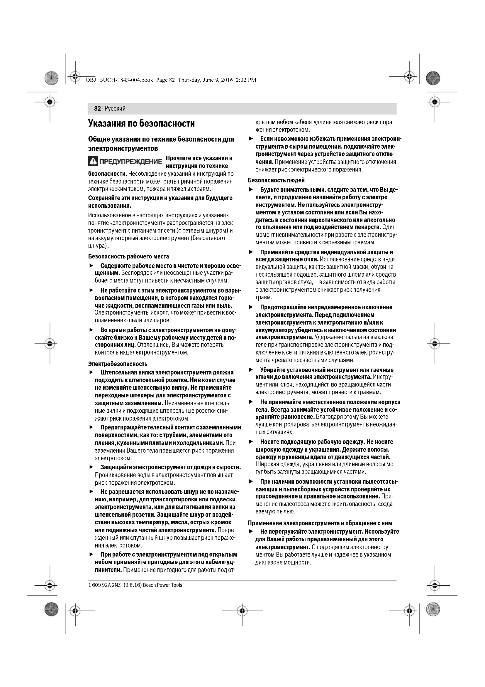 аняйте равновесие. Благодаря этому Вы можете лучше контролировать электроинструмент в неожидан- ных ситуациях. Носите подходящую рабочую одежду. Не носите широкую одежду и украшения. Держите волосы, одежду и рукавицы вдали от движущихся частей. Широкая одежда, украшения или длинные волосы мо- гут быть затянуты вращающимися частями. При наличии возможности установки пылеотсасы- вающих и пылесборных устройств проверяйте их присоединение и правильное использование. При- менение пылеотсоса может снизить опасность, созда- ваемую пылью. Применение электроинструмента и обращение с ним Не перегружайте электроинструмент. Используйте для Вашей работы предназначенный для этого электроинструмент. С подходящим электроинстру- ментом Вы работаете лучше и надежнее в указанном диапазоне мощности. OBJ_BUCH-1843-004.book Page 82 Thursday, June 9, 2016 2:02 PMРусский | 83 Bosch Power Tools 1 609 92A 2NZ | (9.6.16) Не работайте с электроинструментом при неисправ- ном выключателе. Электроинструмент, который не поддается включению или выключению, опасен и дол- жен быть отремонтирован. До начала наладки электроинструмента, перед за- меной принадлежностей и прекращением работы отключайте штепсельную вилку от розетки сети и/или выньте аккумулятор. Эта мера предос- торожности предотвращает непреднамеренное вклю- чение электроинструмента. Храните электроинструменты в недоступном для детей месте. Не разрешайте пользоваться электро- инструментом лицам, которые не знакомы с ним или не читали настоящих инструкций. Электро- инструменты опасны в руках неопытных лиц. Тщательно ухаживайте за электроинструментом. Проверяйте безупречную функцию и ход движу- щихся частей электроинструмента, отсутствие поло- мок или повреждений, отрицательно влияющих на функцию электроинструмента. Поврежденные ча- сти должны быть отремонтированы до использова- ния электроинструмента. Плохое обслуживание элек- троинструментов является причиной большого числа несчастных случаев. Держите режущий инструмент в заточенном и чи- стом состоянии. Заботливо ухоженные режущие ин- струменты с острыми режущими кромками реже закли- ниваются и их легче вести. Применяйте электроинструмент, принадлежности, рабочие инструменты и т.п. в соответствии с настоя- щими инструкциями. Учитывайте при этом рабочие условия и выполняемую работу. Использование электроинструментов для непредусмотренных работ может привести к опасным ситуациям.