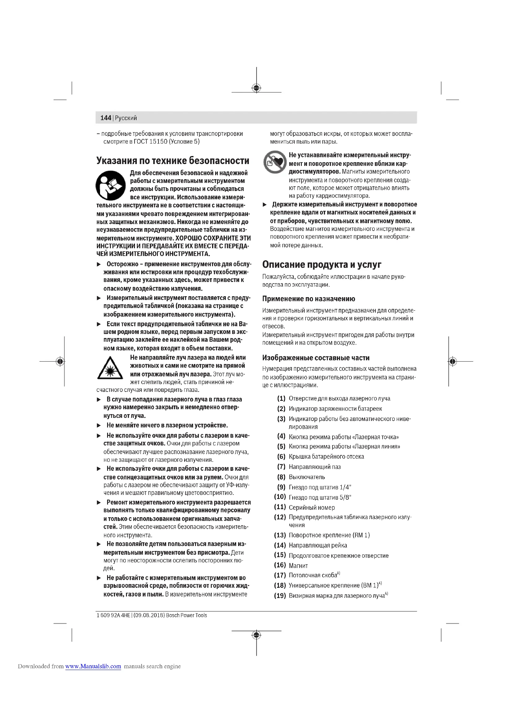 – при разгрузке/погрузке не допускается использова- ние любого вида техники, работающей по принципу зажима упаковки Русский | 143 Bosch Power Tools 1 609 92A 4HE | (09.08.2018) Downloaded from www.Manualslib.com manuals search engine144 | Русский 1 609 92A 4HE | (09.08.2018) Bosch Power Tools – подробные требования к условиям транспортировки смотрите в ГОСТ 15150 (Условие 5) Указания по технике безопасности Для обеспечения безопасной и надежной работы с измерительным инструментом должны быть прочитаны и соблюдаться все инструкции. Использование измери- тельного инструмента не в соответствии с настоящи- ми указаниями чревато повреждением интегрирован- ных защитных механизмов. Никогда не изменяйте до неузнаваемости предупредительные таблички на из- мерительном инструменте. ХОРОШО СОХРАНИТЕ ЭТИ ИНСТРУКЦИИ И ПЕРЕДАВАЙТЕ ИХ ВМЕСТЕ С ПЕРЕДА- ЧЕЙ ИЗМЕРИТЕЛЬНОГО ИНСТРУМЕНТА. u Осторожно – применение инструментов для обслу- живания или юстировки или процедур техобслужи- вания, кроме указанных здесь, может привести к опасному воздействию излучения. u Измерительный инструмент поставляется с преду- предительной табличкой (показана на странице с изображением измерительного инструмента). u Если текст предупредительной таблички не на Ва- шем родном языке, перед первым запуском в экс- плуатацию заклейте ее наклейкой на Вашем род- ном языке, которая входит в объем поставки. Не направляйте луч лазера на людей или животных и сами не смотрите на прямой или отражаемый луч лазера. Этот луч мо- жет слепить людей, стать причиной не- счастного случая или повредить глаза. u В случае попадания лазерного луча в глаз глаза нужно намеренно закрыть и немедленно отвер- нуться от луча. u Не меняйте ничего в лазерном устройстве.u Не используйте очки для работы с лазером в каче- стве защитных очков. Очки для работы с лазером обеспечивают лучшее распознавание лазерного луча, но не защищают от лазерного излучения. u Не используйте очки для работы с лазером в каче- стве солнцезащитных очков или за рулем. Очки для работы с лазером не обеспечивают защиту от УФ-излу- чения и мешают правильному цветовосприятию. u Ремонт измерительного инструмента разрешается выполнять только квалифицированному персоналу и только с использованием оригинальных запча- стей. Этим обеспечивается безопасность измеритель- ного инструмента. u Не позволяйте детям пользоваться лазерным из- мерительным инструментом без присмотра. Дети могут по неосторожности ослепить посторонних лю-