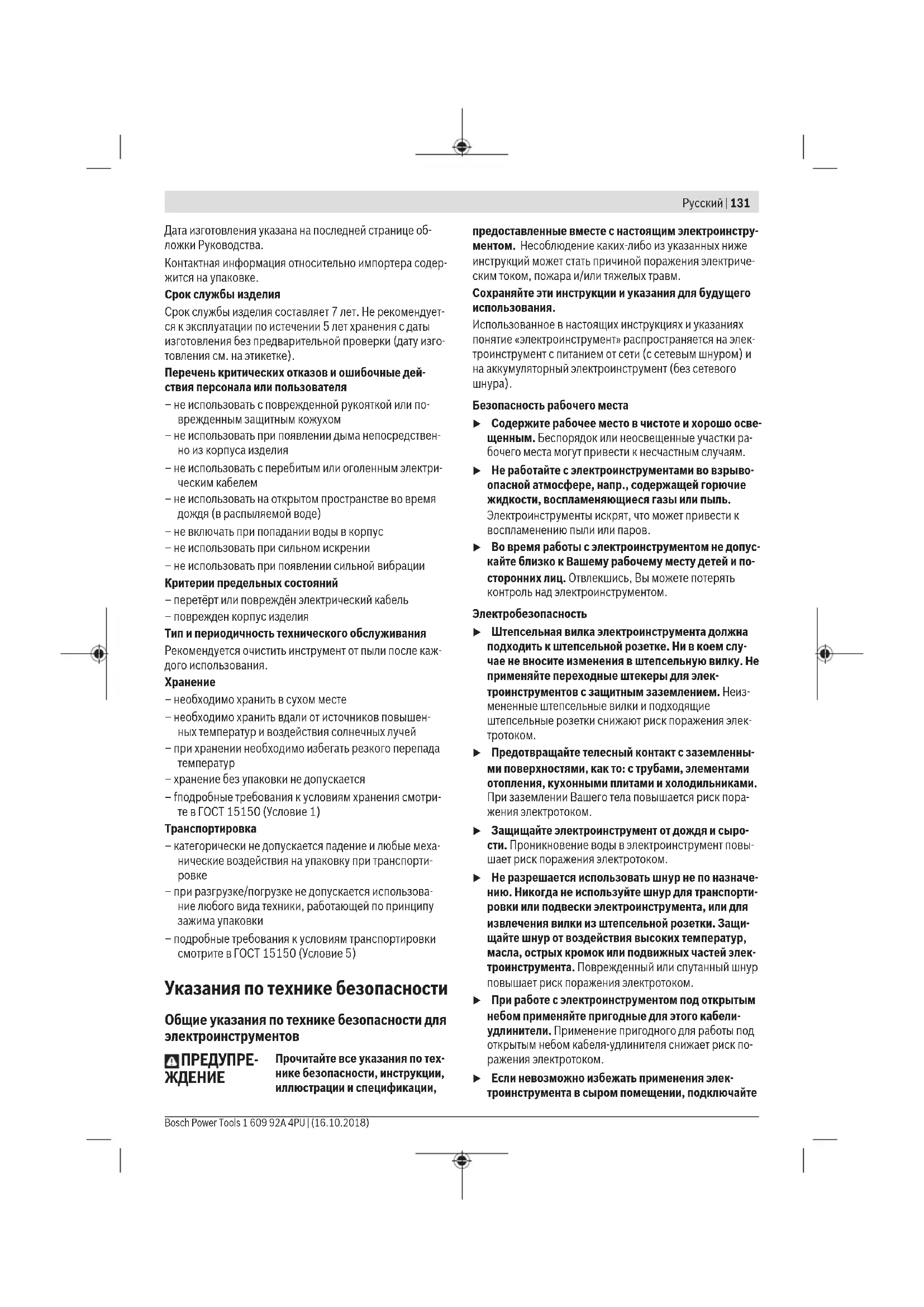 u Предотвращайте телесный контакт с заземленны- ми поверхностями, как то: с трубами, элементами отопления, кухонными плитами и холодильниками. При заземлении Вашего тела повышается риск пора- жения электротоком. u Защищайте электроинструмент от дождя и сыро- сти. Проникновение воды в электроинструмент повы- шает риск поражения электротоком. u Не разрешается использовать шнур не по назначе- нию. Никогда не используйте шнур для транспорти- ровки или подвески электроинструмента, или для извлечения вилки из штепсельной розетки. Защи- щайте шнур от воздействия высоких температур, масла, острых кромок или подвижных частей элек- троинструмента. Поврежденный или спутанный шнур повышает риск поражения электротоком. u При работе с электроинструментом под открытым небом применяйте пригодные для этого кабели- удлинители. Применение пригодного для работы под открытым небом кабеля-удлинителя снижает риск по- ражения электротоком. u Если невозможно избежать применения элек- троинструмента в сыром помещении, подключайте Русский | 131 Bosch Power Tools 1 609 92A 4PU | (16.10.2018)132 | Русский 1 609 92A 4PU | (16.10.2018) Bosch Power Tools электроинструмент через устройство защитного от- ключения. Применение устройства защитного отклю- чения снижает риск электрического поражения. Безопасность людей u Будьте внимательны, следите за тем, что делаете, и продуманно начинайте работу с электроинструмен- том. Не пользуйтесь электроинструментом в уста- лом состоянии или под воздействием наркотиков, алкоголя или лекарственных средств. Один момент невнимательности при работе с электроинструментом может привести к серьезным травмам. u Применяйте средства индивидуальной защиты. Всегда носите защитные очки. Использование средств индивидуальной защиты, как то: защитной маски, обуви на нескользящей подошве, защитного шлема или средств защиты органов слуха, в зависимо- сти от вида работы с электроинструментом снижает риск получения травм. u Предотвращайте непреднамеренное включение электроинструмента. Перед тем как подключить электроинструмент к сети и/или к аккумулятору, поднять или переносить электроинструмент, убе- дитесь, что он выключен. Удержание пальца на вы- ключателе при транспортировке электроинструмента и подключение к сети питания включенного элек- троинструмента чревато несчастными случаями. u Убирайте установочный инструмент или гаечные ключи до включения электроинструмента. Инстру- мент или ключ, находящийся во вращающейся части электроинструмента, может привести к травмам. u Не принимайте неестественное положение корпуса тела. Всегда занимайте устойчивое положение и сохраняйте равновесие. Благодаря этому Вы можете лучше контролировать электроинструмент в неожи- данных ситуациях. u Носите подходящую рабочую одежду. Не носите широкую одежду и украшения. Держите волосы и одежду вдали от подвижных деталей. Широкая оде- жда, украшения или длинные волосы могут быть за- тянуты вращающимися частями. u При наличии возможности установки пылеотсасы- вающих и пылесборных устройств проверяйте их присоединение и правильное использование. При- менение пылеотсоса может снизить опасность, созда- ваемую пылью. u Хорошее знание электроинструментов, полученное в результате частого их использования, не должно приводить к самоуверенности и игнорированию техники безопасности обращ
