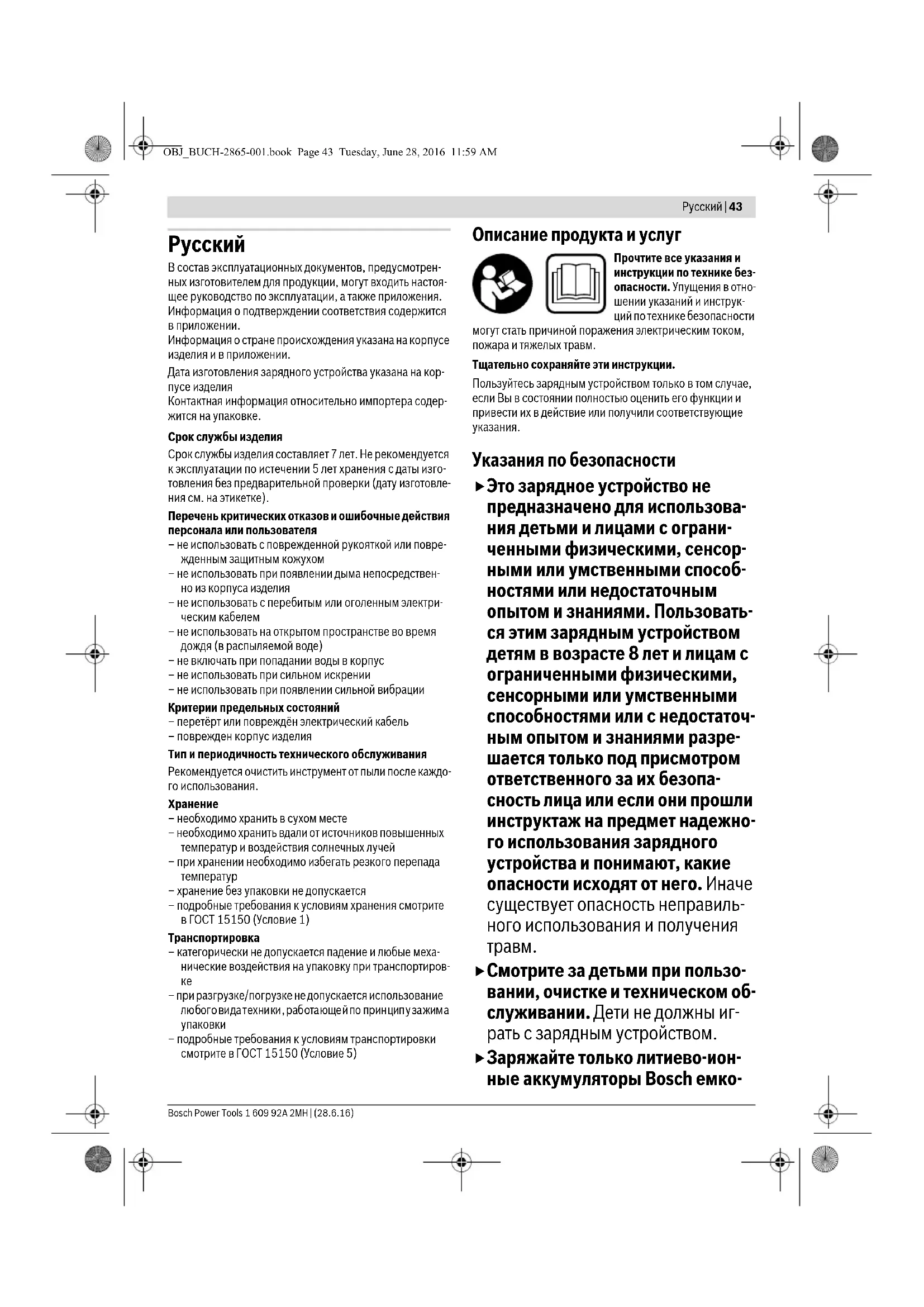– подробные требования к условиям транспортировки смотрите в ГОСТ 15150 (Условие 5) Описание продукта и услуг Прочтите все указания и инструкции по технике без- опасности. Упущения в отно- шении указаний и инструк- ций по технике безопасности могут стать причиной поражения электрическим током, пожара и тяжелых травм. Тщательно сохраняйте эти инструкции. Пользуйтесь зарядным устройством только в том случае, если Вы в состоянии полностью оценить его функции и привести их в действие или получили соответствующие