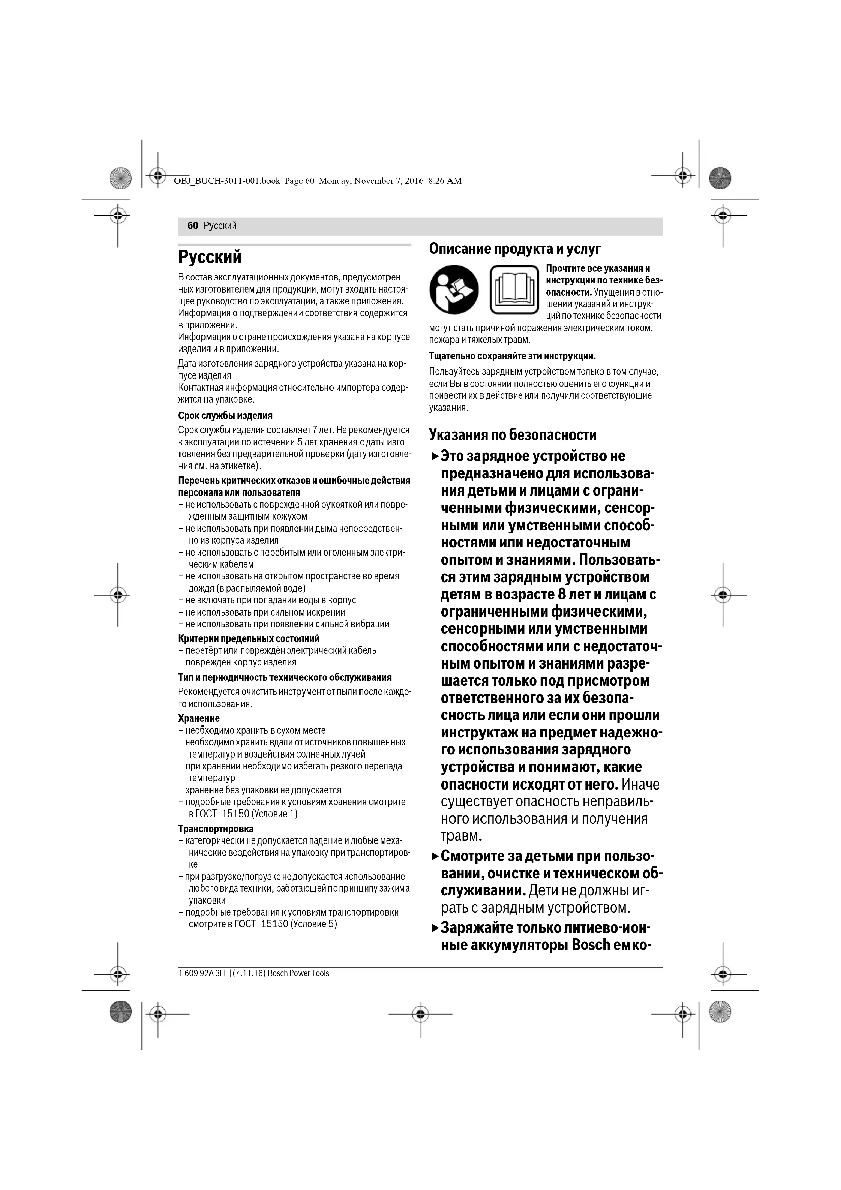 – подробные требования к условиям транспортировки смотрите в ГОСТ 15150 (Условие 5) Описание продукта и услуг Прочтите все указания и инструкции по технике без- опасности. Упущения в отно- шении указаний и инструк- ций по технике безопасности могут стать причиной поражения электрическим током, пожара и тяжелых травм. Тщательно сохраняйте эти инструкции. Пользуйтесь зарядным устройством только в том случае, если Вы в состоянии полностью оценить его функции и привести их в действие или получили соответствующие