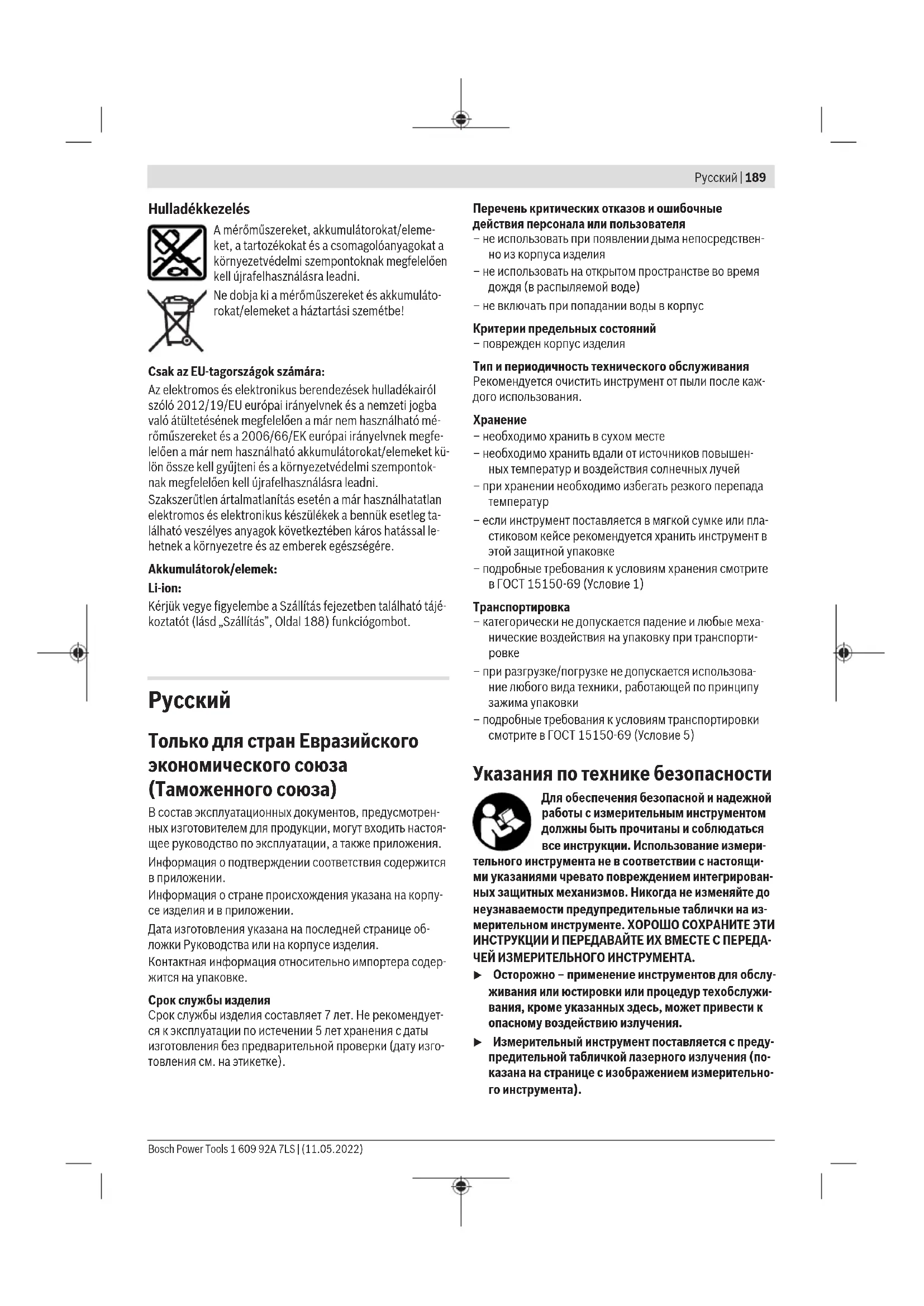 – при разгрузке/погрузке не допускается использова- ние любого вида техники, работающей по принципу зажима упаковки – подробные требования к условиям транспортировки смотрите в ГОСТ 15150-69 (Условие 5) Указания по технике безопасности Для обеспечения безопасной и надежной работы с измерительным инструментом должны быть прочитаны и соблюдаться все инструкции. Использование измери- тельного инструмента не в соответствии с настоящи- ми указаниями чревато повреждением интегрирован- ных защитных механизмов. Никогда не изменяйте до неузнаваемости предупредительные таблички на из- мерительном инструменте. ХОРОШО СОХРАНИТЕ ЭТИ ИНСТРУКЦИИ И ПЕРЕДАВАЙТЕ ИХ ВМЕСТЕ С ПЕРЕДА- ЧЕЙ ИЗМЕРИТЕЛЬНОГО ИНСТРУМЕНТА. u Осторожно – применение инструментов для обслу- живания или юстировки или процедур техобслужи- вания, кроме указанных здесь, может привести к опасному воздействию излучения. u Измерительный инструмент поставляется с преду- предительной табличкой лазерного излучения (по- казана на странице с изображением измерительно- го инструмента). Bosch Power Tools 1 609 92A 7LS | (11.05.2022)190 | Русский u Если текст предупредительной таблички лазерного излучения не на Вашем родном языке, перед пер- вым запуском в эксплуатацию заклейте ее наклей- кой на Вашем родном языке, которая входит в объем поставки. Не направляйте луч лазера на людей или животных и сами не смотрите на прямой или отражаемый луч лазера. Этот луч мо- жет слепить людей, стать причиной не- счастного случая или повредить глаза. u В случае попадания лазерного луча в глаз глаза нужно намеренно закрыть и немедленно отвер- нуться от луча. u Не меняйте ничего в лазерном устройстве. u Не используйте очки для работы с лазерным инструментом (принадлежность) в качестве защит- ных очков. Очки для работы с лазерным инструмен- том обеспечивают лучшее распознавание лазерного луча, но не защищают от лазерного излучения. u Не используйте очки для работы с лазерным инструментом (принадлежность) в качестве солн- цезащитных очков или за рулем. Очки для работы с лазером не обеспечивают защиту от УФ-излучения и мешают правильному цветовосприятию. u Ремонт измерительного инструмента разрешается выполнять только квалифицированному персоналу и только с использованием оригинальных запча- стей. Этим обеспечивается безопасность измеритель- ного инструмента. u Не позволяйте детям пользоваться лазерным из- мерительным инструментом без присмотра. Дети могут по неосторожности ослепить себя или посто- ронних людей. u Не работайте с измерительным инструментом во взрывоопасной среде, поблизости от горючих жид- костей, газов и пыли. В измерительном инструменте могут образоваться искры, от которых может воспла- мениться пыль или пары. u Не вскрывайте аккумулятор. При этом возникает опасность короткого замыкания. u При повреждении и ненадлежащем использовании аккумулятора может выделиться газ. Аккумулятор может возгораться или взрываться.Обеспечьте при- ток свежего воздуха и при возникновении жалоб обра- титесь к врачу. Газы могут вызвать раздражение дыха- тельных путей. u При неправильном использовании из аккумулятора может потечь жидкость. Избегайте соприкоснове- ния с ней. При случайном контакте промойте соот- ветствующее место водой. Если эта жидкость попа- дет в глаза, то дополнительно обратитесь за помощью к врачу. Выт