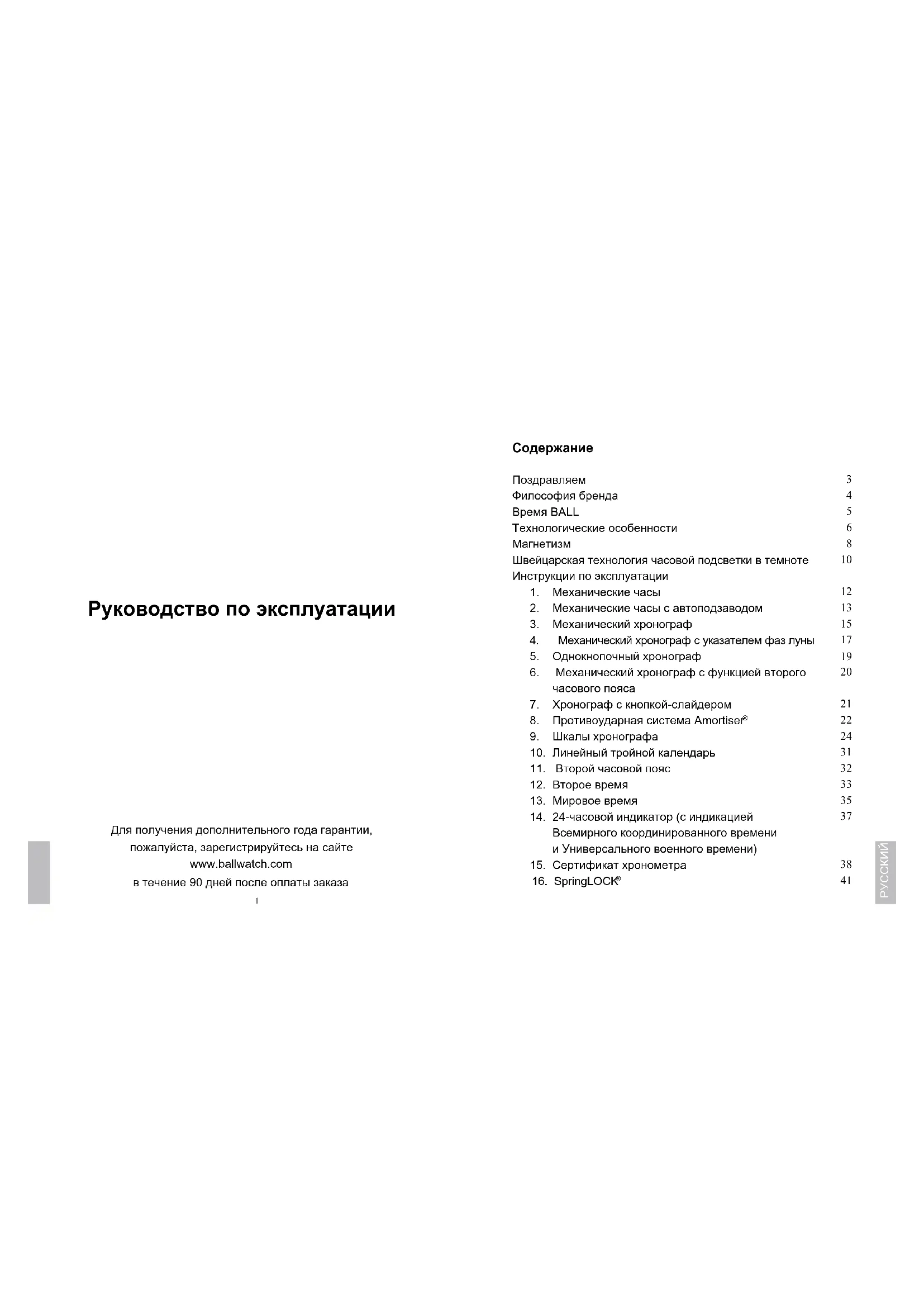 Поздравляем! Поздравляем Вас с приобретением часов BALL и благодарим Вас за доверие, оказанное нашей компании, одному из самых известных швейцарских брендов в мире. С этого момента Ваше запястье будет украшать подлинное часовое произведение, связанное с историей американской железной дороги. Все модели BALL полностью произведены в Швейцарии и разработаны с учетом самых строгих требований. Используемые нами материалы гарантируют исключительную долговечность Ваших часов даже в самых неблагоприятных условиях. Перед тем как поступить в продажу, Ваши новые часы прошли строгий контроль качества. Для обеспечения безупречной работы часов мы рекомендуем Вам следовать советам, представленным в настоящей инструкции (инструкция по эксплуатации также доступна на нашем сайте www.ballwatch.com в разделе «Обслуживание клиентов»). Благодарим Вас за оказанное нам доверие. С уважением, BALL Watch Company РУССКИЙ4 5