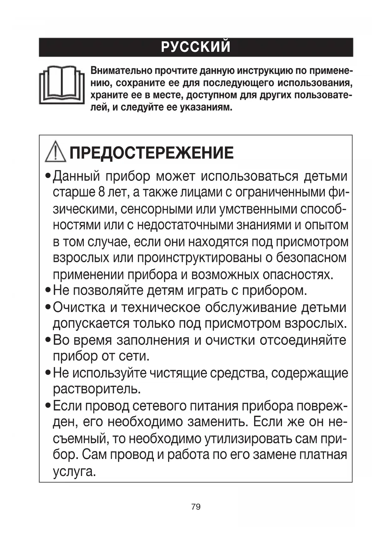 Данный прибор может использоваться детьми старше 8 лет, атакже лицами сограниченными фи- зическими, сенсорными или умственными способ- ностями или снедостаточными знаниями иопытом втом случае, если они находятся под присмотром взрослых или проинструктированы обезопасном применении прибора ивозможных опасностях