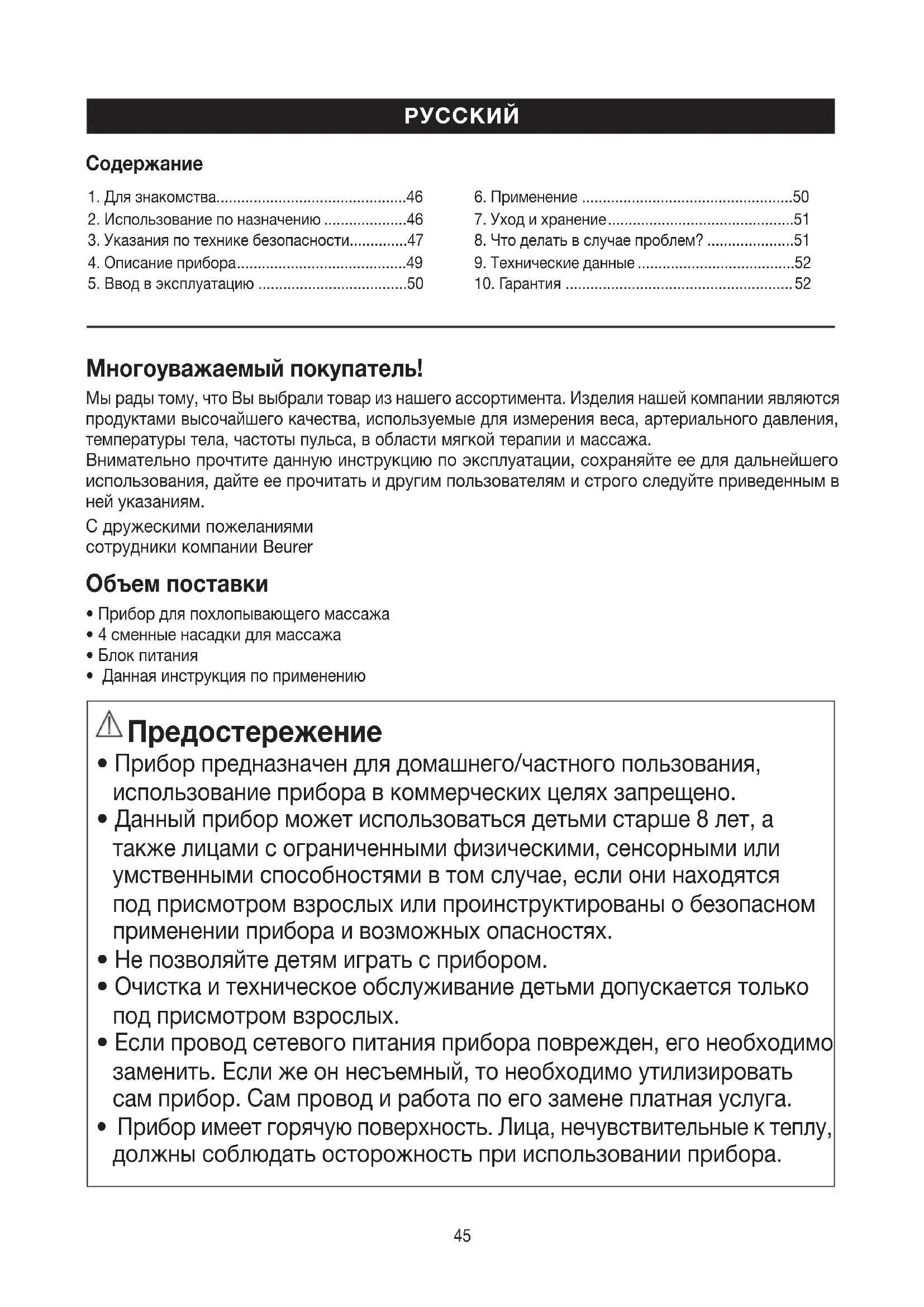 Мы предоставляем гарантию на дефекты материалов и изготовления на срок 24 месяца со дня про- дажи через розничную сеть. Гарантия не распространяется: - на случаи ущерба, вызванного неправильным использованием - на быстроизнашивающиеся части (насадки , аккумулятор) - на дефекты, о которых покупатель знал в момент покупки - на случаи собственной вины покупателя. Товар сертифицирован: бытовые массажеры – ООО ”Сертификация и экспертиза“ № ТС RU C- DE. АY 04.B.00630, серия 0257447, срок действия с 29.10.2015 по 28.10.2018 гг. Срок эксплуатации изделия: мин. 5 лет Фирма-изготовитель: Бойрер Гмбх, Софлингер штрассе 218 89077-УЛМ, Германия Фирма-импортер: ООО Бойрер 109451 г. Москва , ул. Перерва, 62, корп.2,офис 3 Сервисный центр: 109451 г. Москва , ул. Перерва, 62, корп.2 Тел(факс) 495—658 54 90 bts-service@ctdz.ru Дата продажи Подпись продавца Штамп магазина Подпись покупателя Возможны ошибки и изменения53 POLSKI Szanowni Klienci, bardzo dziękujemy za wybór jednego z naszych wyrobów. Nazwa naszej firmy oznacza wysokiej jakości wyroby, dokładnie sprawdzone w zakresie zastosowań w obszarach nagrzewania, pomiarów masy ciała, ciśnienia krwi, temperatury ciała, tętna, łagodnej terapii, masażu i powietrza.Prosimy o dokładne przeczytanie niniejszej instrukcji obsługi oraz o zatrzymanie jej do późniejszego użytku, udostępniając ją innym użytkownikom oraz przestrzegając zawartych w niej informacji.Z poważaniem,Zespół firmy Beurer Zakres dostawy