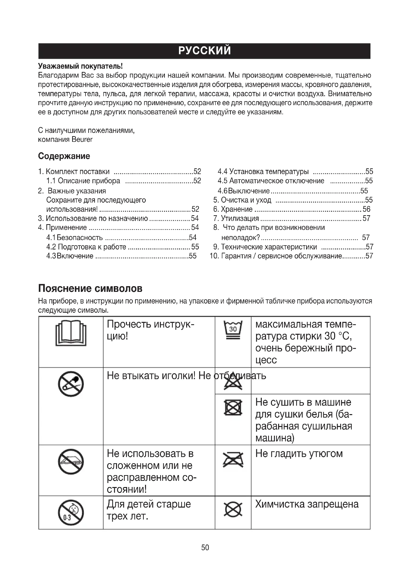 Химчистка запрещена Уважаемый покупатель! Благодарим Вас завыбор продукции нашей компании. Мы производим современные, тщательно протестированные, высококачественные изделия для обогрева, измерения массы, кровяного давления, температуры тела, пульса, для легкой терапии, массажа, красоты иочистки воздуха. Внимательно прочтите данную инструкцию поприменению, сохраните ее для последующего использования, держите ее вдоступном для других пользователей месте и следуйте ее указаниям. С наилучшими пожеланиями, компания Beurer51