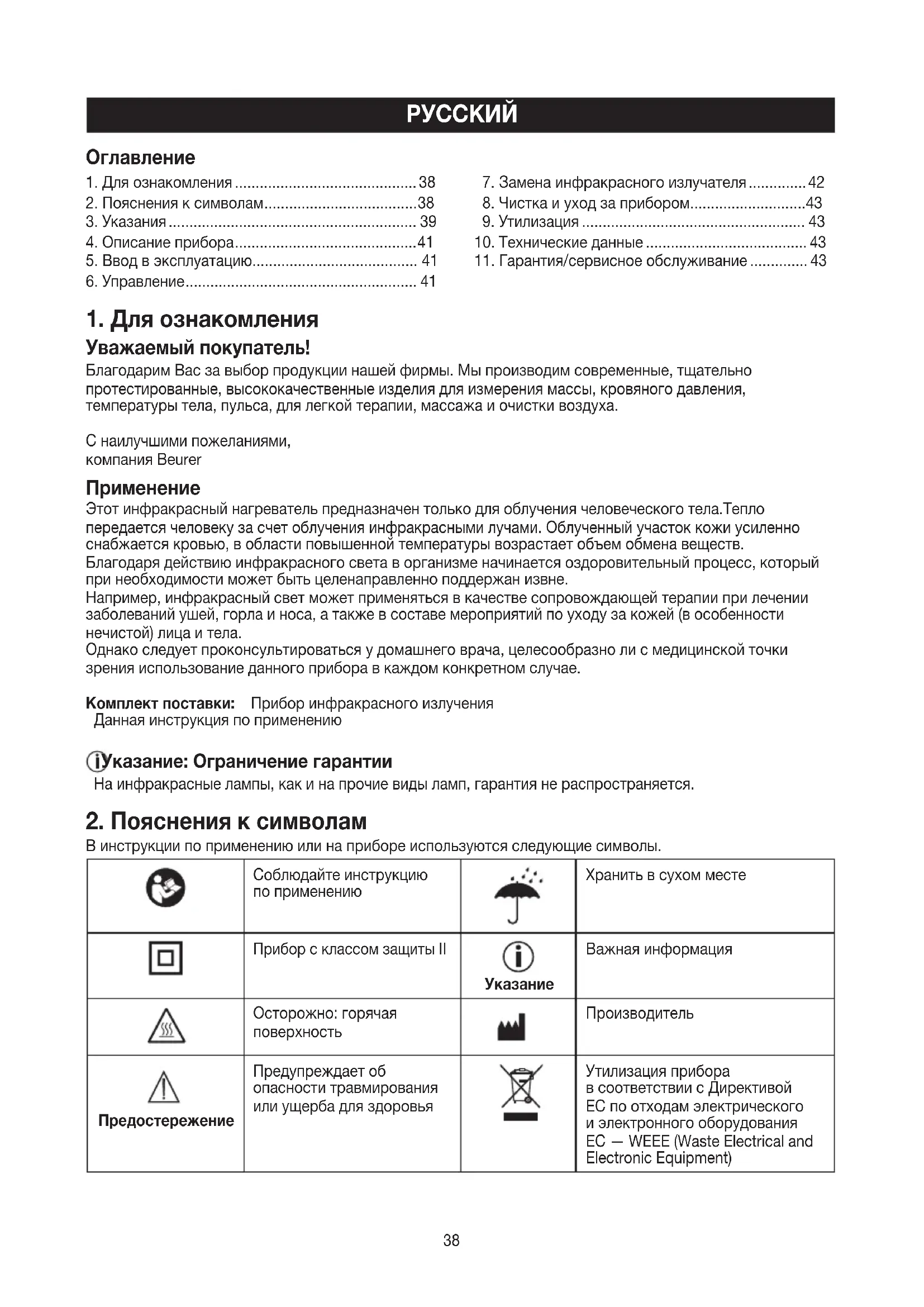 Уважаемый покупатель! Благодарим Вас завыбор продукции нашей фирмы. Мы производим современные, тщательно протестированные, высококачественные изделия для измерения массы, кровяного давления, температуры тела, пульса, для легкой терапии, массажа иочистки воздуха. Снаилучшими пожеланиями, компания Beurer