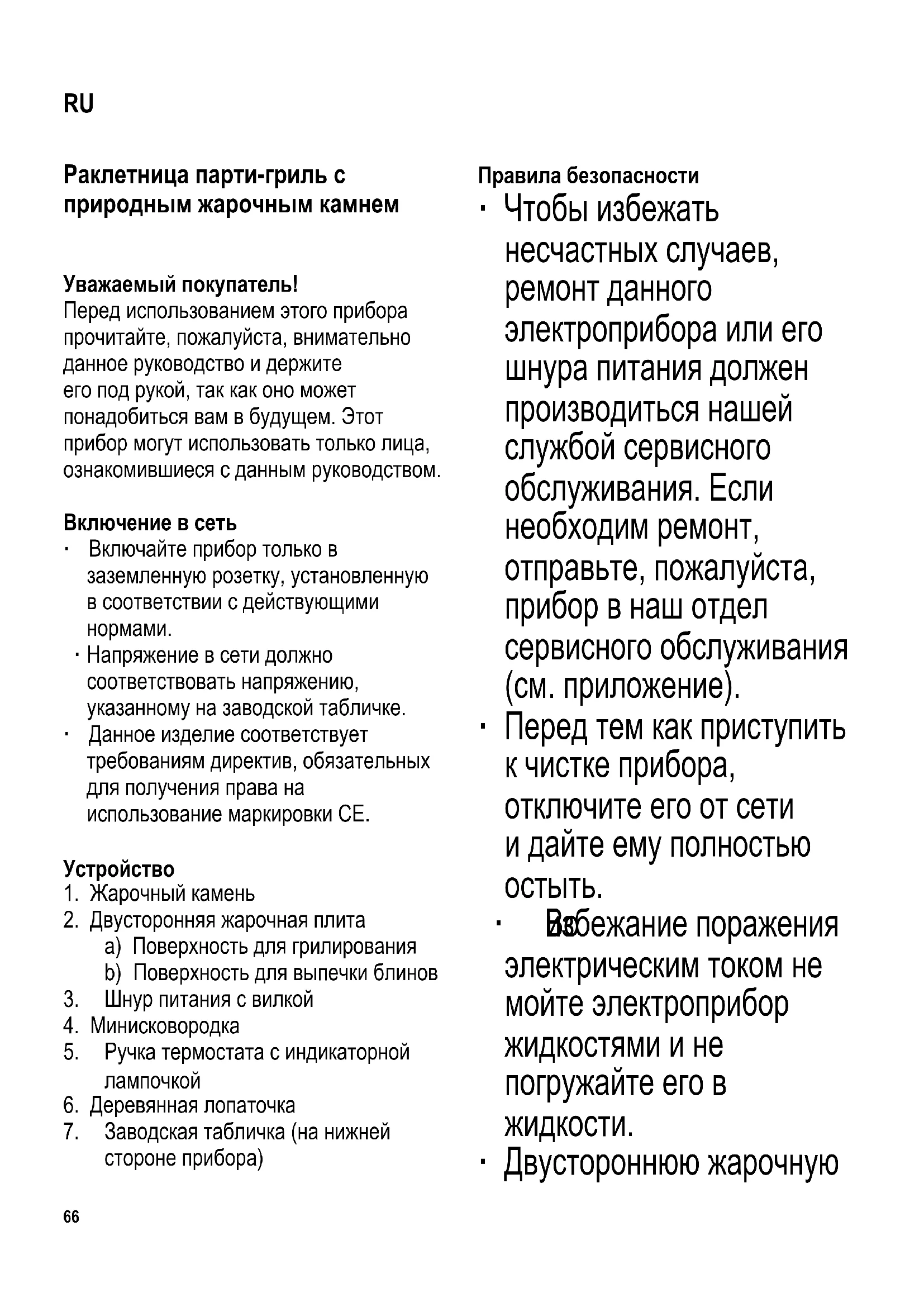 Раклетница парти-гриль с природным жарочным камнем Уважаемый покупатель! Перед использованием этого прибора прочитайте, пожалуйста, внимательно данное руководство и держите его под рукой, так как оно может понадобиться вам в будущем. Этот прибор могут использовать только лица, ознакомившиеся с данным руководством. Включение в сеть ∙ Включайте прибор только в заземленную розетку, установленную в соответствии с действующими