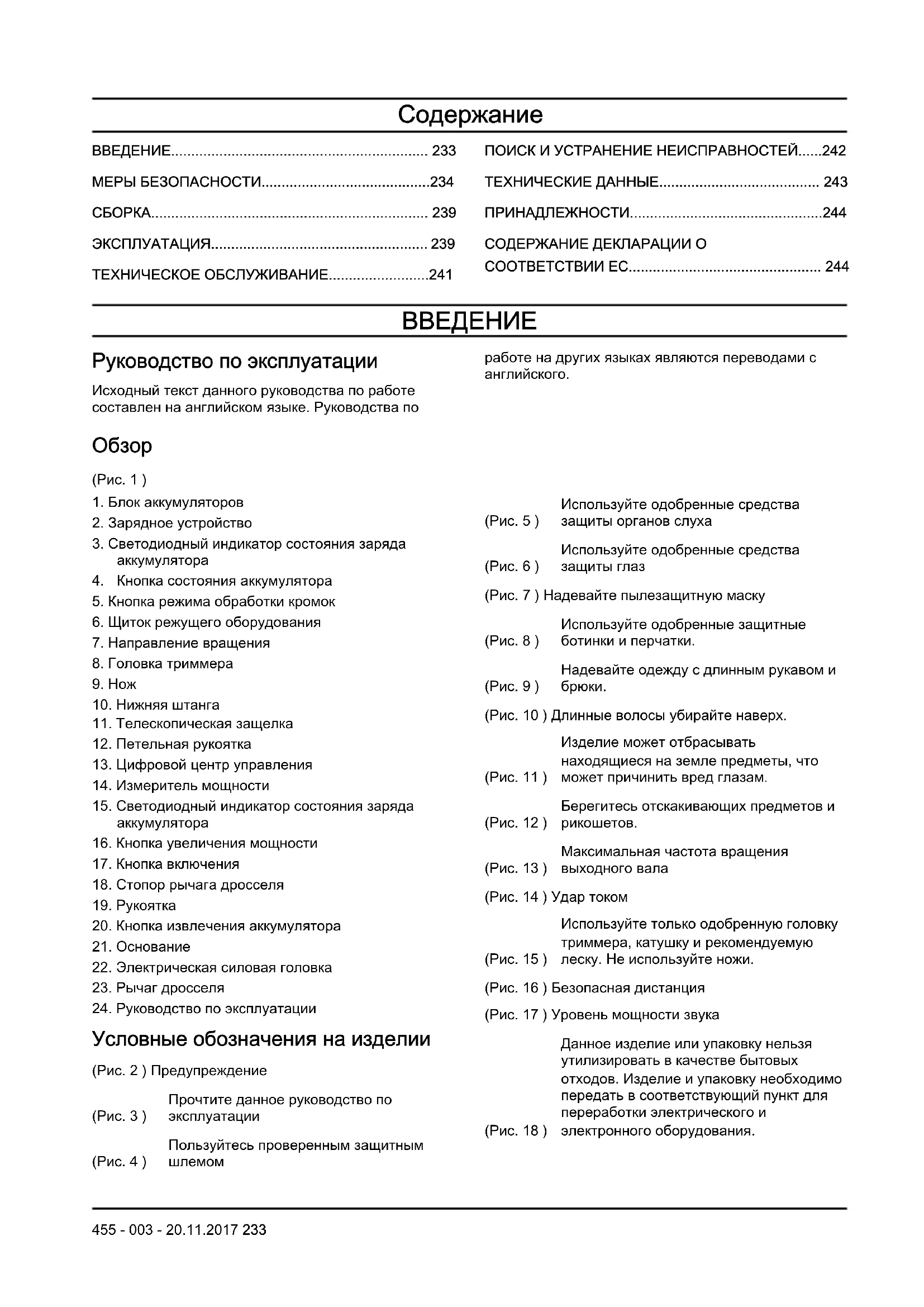 Примечание: Когда блок аккумуляторов полностью разряжен, двигатель мгновенно останавливается. Примечание: Двигатель автоматически останавливается при перегреве блока аккумуляторов или контроллера двигателя во время 240 455 - 003 - 20.11.2017выполнения сложных операций. Дайте двигателю и блоку аккумуляторов остыть. После этого изделие возвращается в рабочее состояние. Эксплуатация триммера для травы