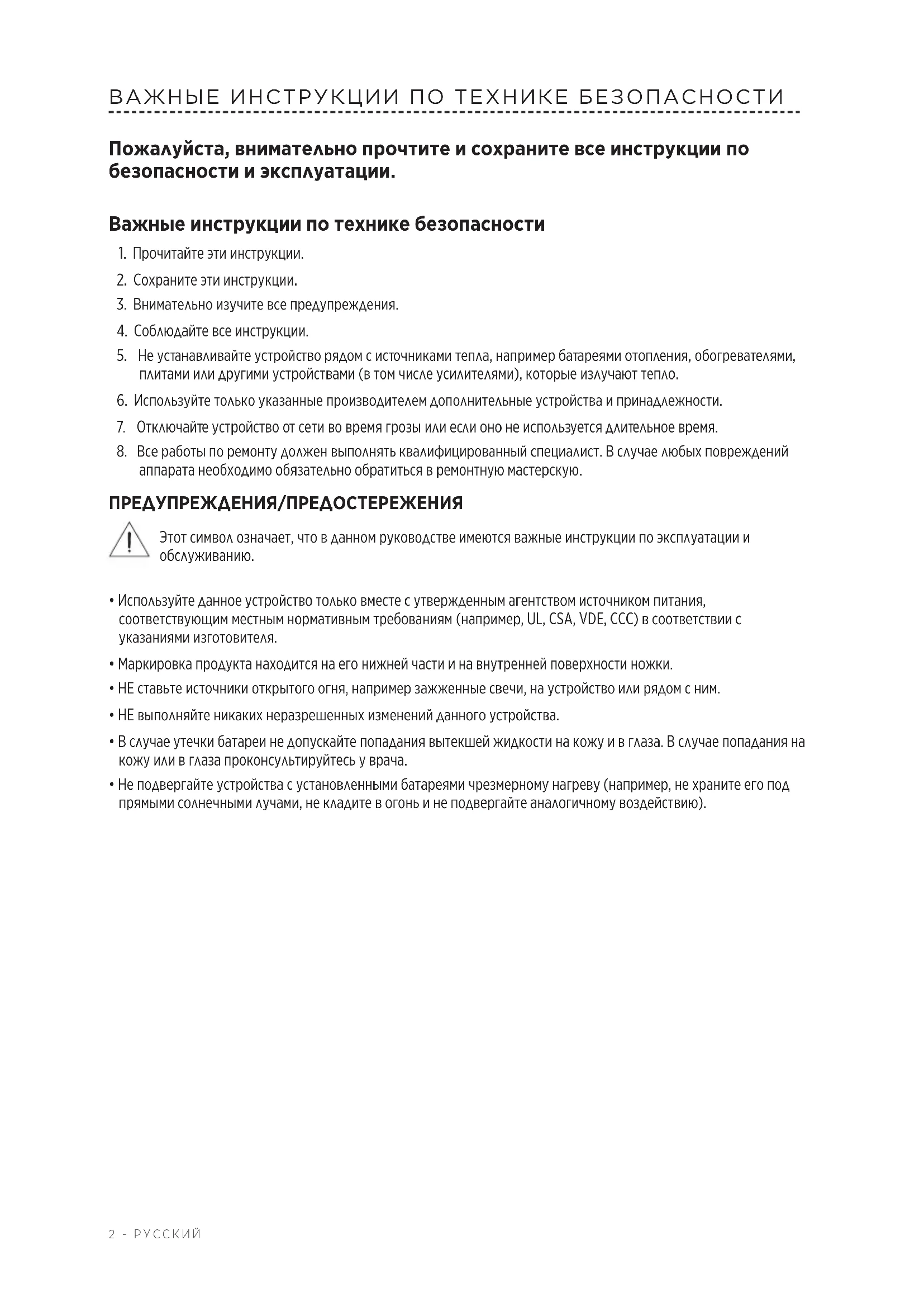ВАЖНЫЕ ИНСТРУКЦИИ ПО ТЕХНИКЕ БЕЗОПАСНОСТИ Пожалуйста, внимательно прочтите и сохраните все инструкции по безопасности и эксплуатации. Важные инструкции по технике безопасности