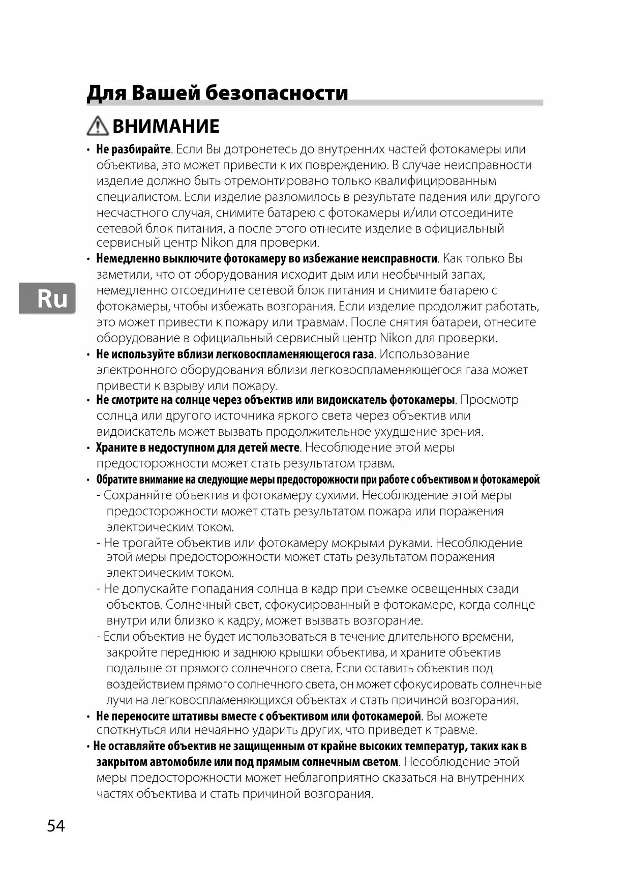 - Не разбирайте. Если Вы дотронетесь до внутренних частей фотокамеры или объектива, это может привести к их повреждению. В случае неисправности изделие должно быть отремонтировано только квалифицированным специалистом. Если изделие разломилось в результате падения или другого несчастного случая, снимите батарею с фотокамеры и/или отсоедините сетевой блок питания, а после этого отнесите изделие в официальный сервисный центр Nikon для проверки.