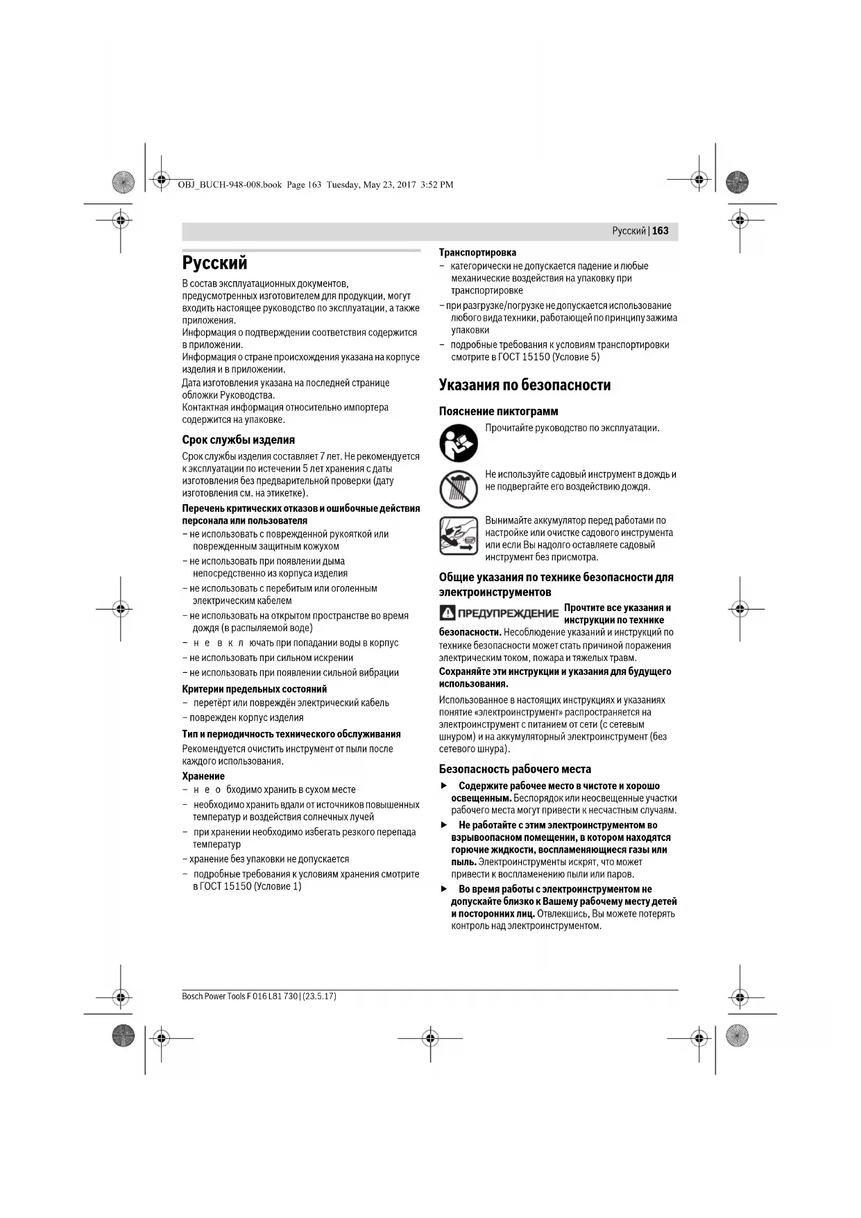 –подробные требования к условиям транспортировки смотрите в ГОСТ 15150 (Условие 5) Указания по безопасности Пояснение пиктограмм Прочитайте руководство по эксплуатации. Не используйте садовый инструмент в дождь и не подвергайте его воздействию дождя. Вынимайте аккумулятор перед работами по настройке или очистке садового инструмента или если Вы надолго оставляете садовый инструмент без присмотра. Общие указания по технике безопасности для электроинструментов Прочтите все указания и инструкции по технике безопасности. Несоблюдение указаний и инструкций по технике безопасности может стать причиной поражения электрическим током, пожара и тяжелых травм. Сохраняйте эти инструкции и указания для будущего использования. Использованное в настоящих инструкциях и указаниях понятие «электроинструмент» распространяется на электроинструмент с питанием от сети (с сетевым шнуром) и на аккумуляторный электроинструмент (без сетевого шнура). Безопасность рабочего места Содержите рабочее место в чистоте и хорошо освещенным. Беспорядок или неосвещенные участки рабочего места могут привести к несчастным случаям. Не работайте с этим электроинструментом во взрывоопасном помещении, в котором находятся горючие жидкости, воспламеняющиеся газы или пыль. Электроинструменты искрят, что может привести к воспламенению пыли или паров. Во время работы с электроинструментом не допускайте близко к Вашему рабочему месту детей и посторонних лиц. Отвлекшись, Вы можете потерять контроль над электроинструментом. OBJ_BUCH-948-008.book Page 163 Tuesday, May 23, 2017 3:52 PM164 | Русский F 016 L81 730 | (23.5.17) Bosch Power Tools Электробезопасность Штепсельная вилка электроинструмента должна подходить к штепсельной розетке. Ни в коем случае не изменяйте штепсельную вилку. Не применяйте переходные штекеры для электроинструментов с защитным заземлением. Неизмененные штепсельные вилки и подходящие штепсельные розетки снижают риск поражения электротоком. Предотвращайте телесный контакт с заземленными поверхностями, как то: с трубами, элементами отопления, кухонными плитами и холодильниками. При заземлении Вашего тела повышается риск поражения электротоком. Защищайте электроинструмент от дождя и сырости. Проникновение воды в электроинструмент повышает риск поражения электротоком. Не разрешается использовать шнур не по назначению, например, для транспортировки или подвески электроинструмента, или для вытягивания вилки из штепсельной розетки. Защи- щайте шнур от воздействия высоких температур, масла, острых кромок или подвижных частей элек- троинструмента. Поврежденный или спутанный шнур повышает риск поражения электротоком. При работе с электроинструментом под открытым небом применяйте пригодные для этого кабели- удлинители. Применение пригодного для работы под открытым небом кабеля-удлинителя снижает риск поражения электротоком. Если невозможно избежать применения электроинструмента в сыром помещении, подключайте электроинструмент через устройство защитного отключения. Применение устройства защитного отключения снижает риск электрического