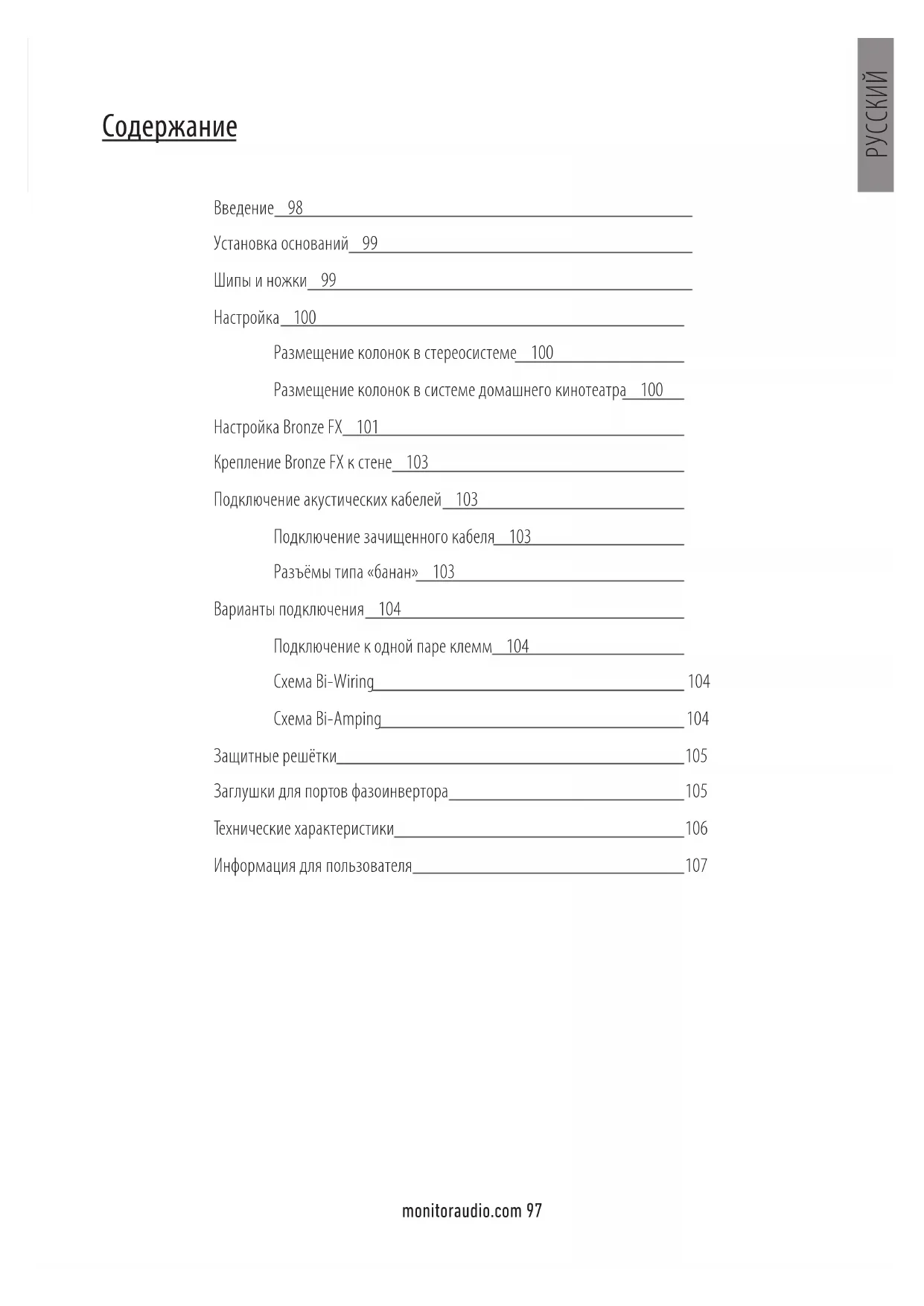 Введение 98 Установка оснований 99 Шипы и ножки 99 Настройка 100 Размещение колонок в стереосистеме 100 Размещение колонок в системе домашнего кинотеатра 100 Настройка Bronze FX 101 Крепление Bronze FX к стене 103 Подключение акустических кабелей 103 Подключение зачищенного кабеля 103 Разъёмы типа «банан» 103 Варианты подключения 104 Подключение к одной паре клемм 104 Схема Bi-Wiring 104 Схема Bi-Amping 104 Защитные решётки 105 Заглушки для портов фазоинвертора 105 Техническиe характеристики 106 Информация для пользователя 107Bronze Series98