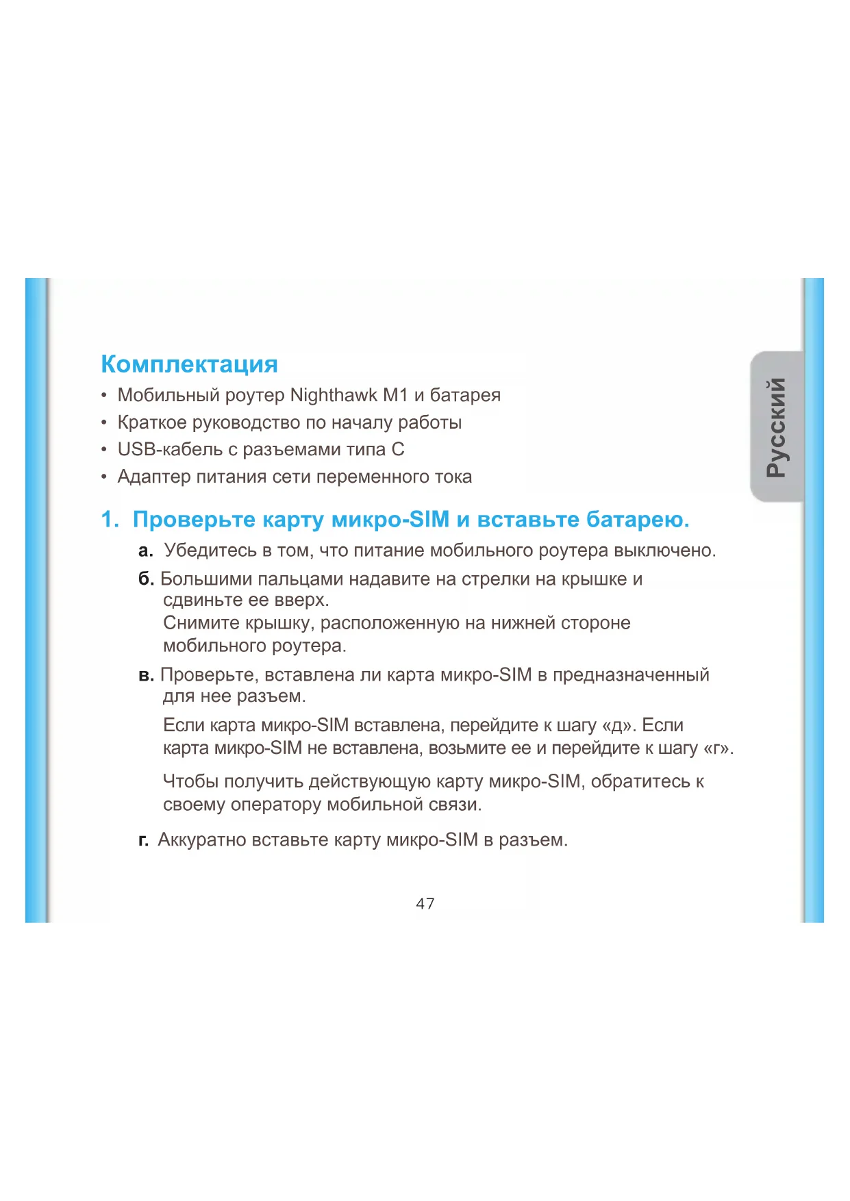 a. Убедитесь в том, что питание мобильного роутера выключено. б. Большими пальцами надавите на стрелки на крышке и сдвиньте ее вверх. Снимите крышку, расположенную на нижней стороне мобильного роутера. в. Проверьте, вставлена ли карта микро-SIM в предназначенный для нее разъем. Если карта микро-SIM вставлена, перейдите к шагу «д». Если карта микро-SIM не вставлена, возьмите ее и перейдите к шагу «г». Чтобы получить действующую карту микро-SIM, обратитесь к своему оператору мобильной связи. г. Аккуратно вставьте карту микро-SIM в разъем. Русский48 д. Совместите контакты батареи с соответствующими контактами в устройстве и вставьте батарею в устройство. е. Если вы приобрели карту микро-SD, вставьте ее в предназначенный для нее разъем. ж. Установите крышку мобильного роутера на место.