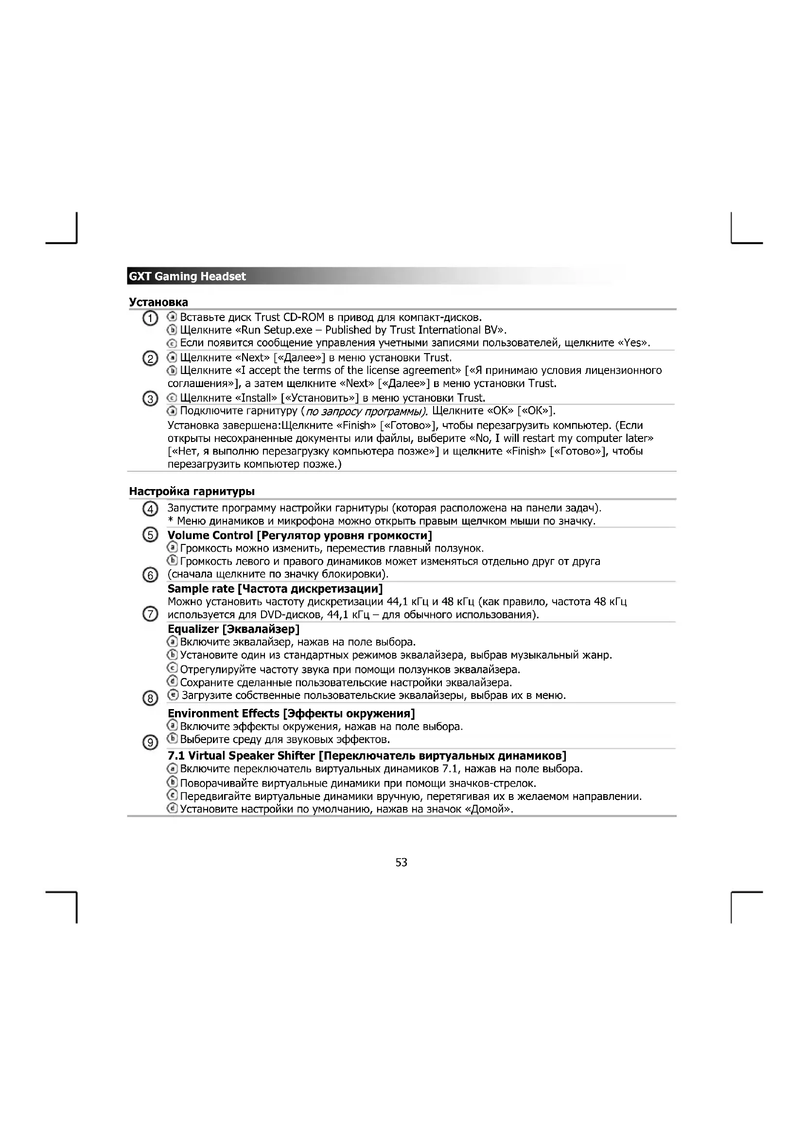 Вставьте диск Trust CD-ROM в привод для компакт-дисков. Щелкните «Run Setup.exe – Published by Trust International BV». Если появится сообщение управления учетными записями пользователей, щелкните «Yes». Щелкните «Next» [«Далее»] в меню установки Trust. Щелкните «I accept the terms of the license agreement» [«Я принимаю условия лицензионного соглашения»], а затем щелкните «Next» [«Далее»] в меню установки Trust. Щелкните «Install» [«Установить»] в меню установки Trust. Подключите гарнитуру ( по запросу программы). Щелкните «OK» [«ОК»]. Установка завершена:Щелкните «Finish» [«Готово»], чтобы перезагрузить компьютер. (Если открыты несохраненные документы или файлы, выберите «No, I will restart my computer later» [«Нет, я выполню перезагрузку компьютера позже»] и щелкните «Finish» [«Готово»], чтобы перезагрузить компьютер позже.)