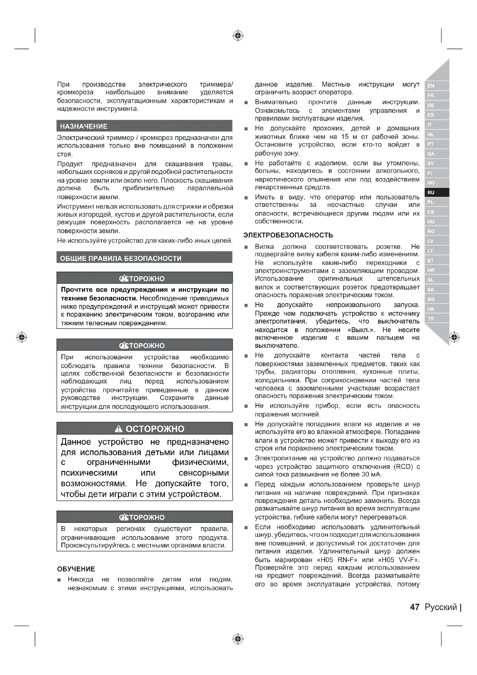 Продукт предназначен для скашивания травы, небольших сорняков и другой подобной растительности на уровне земли или около него. Плоскость скашивания должна быть приблизительно параллельной поверхности земли. Инструмент нельзя использовать для стрижки и обрезки живых изгородей, кустов и другой растительности, если режущая поверхность располагается не на уровне поверхности земли. Не используйте устройство для каких-либо иных целей. ОБЩИЕ ПРАВИЛА БЕЗОПАСНОСТИ
