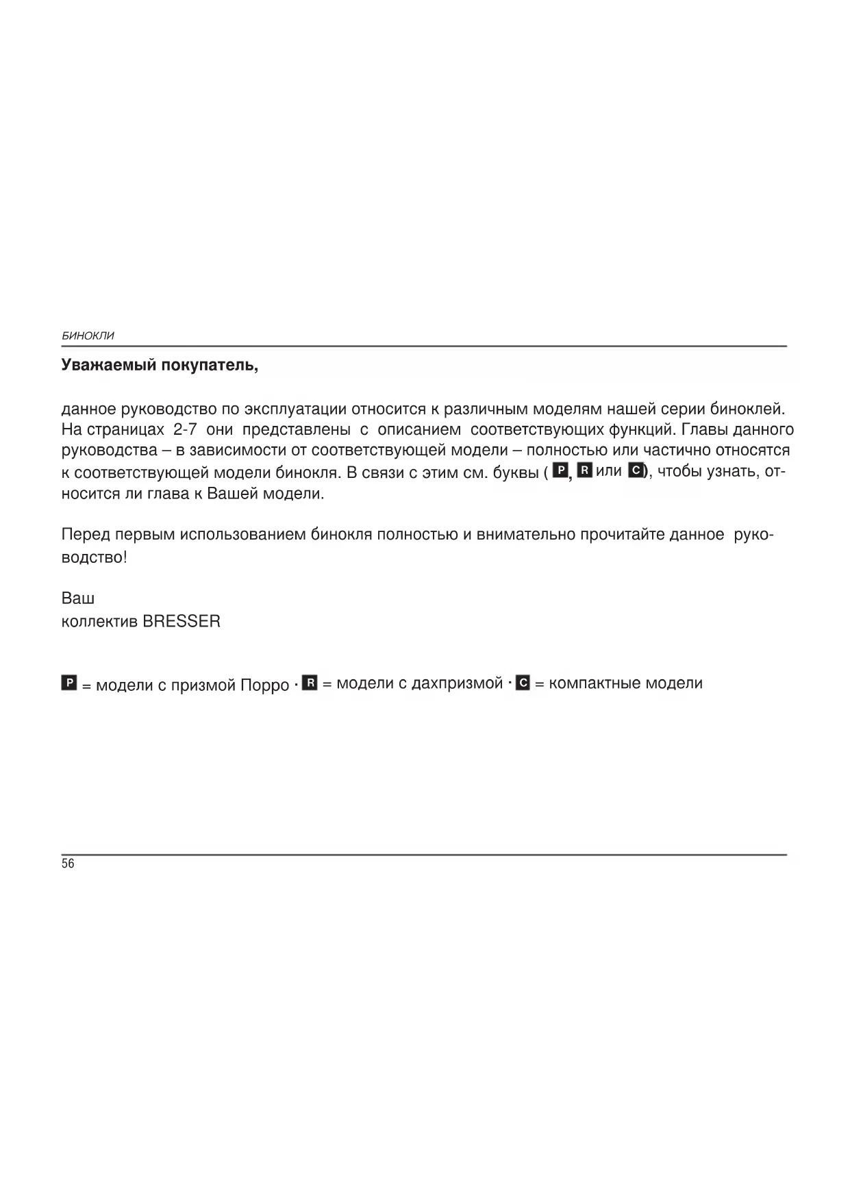 RU56 Уважаемый покупатель, данное руководство по эксплуатации относится к различным моделям нашей серии биноклей. На страницах 2-7 они представлены с описанием соответствующих функций. Главы данного руководства – в зависимости от соответствующей модели – полностью или частично относятся к соответствующей модели бинокля. В связи с этим см. буквы (