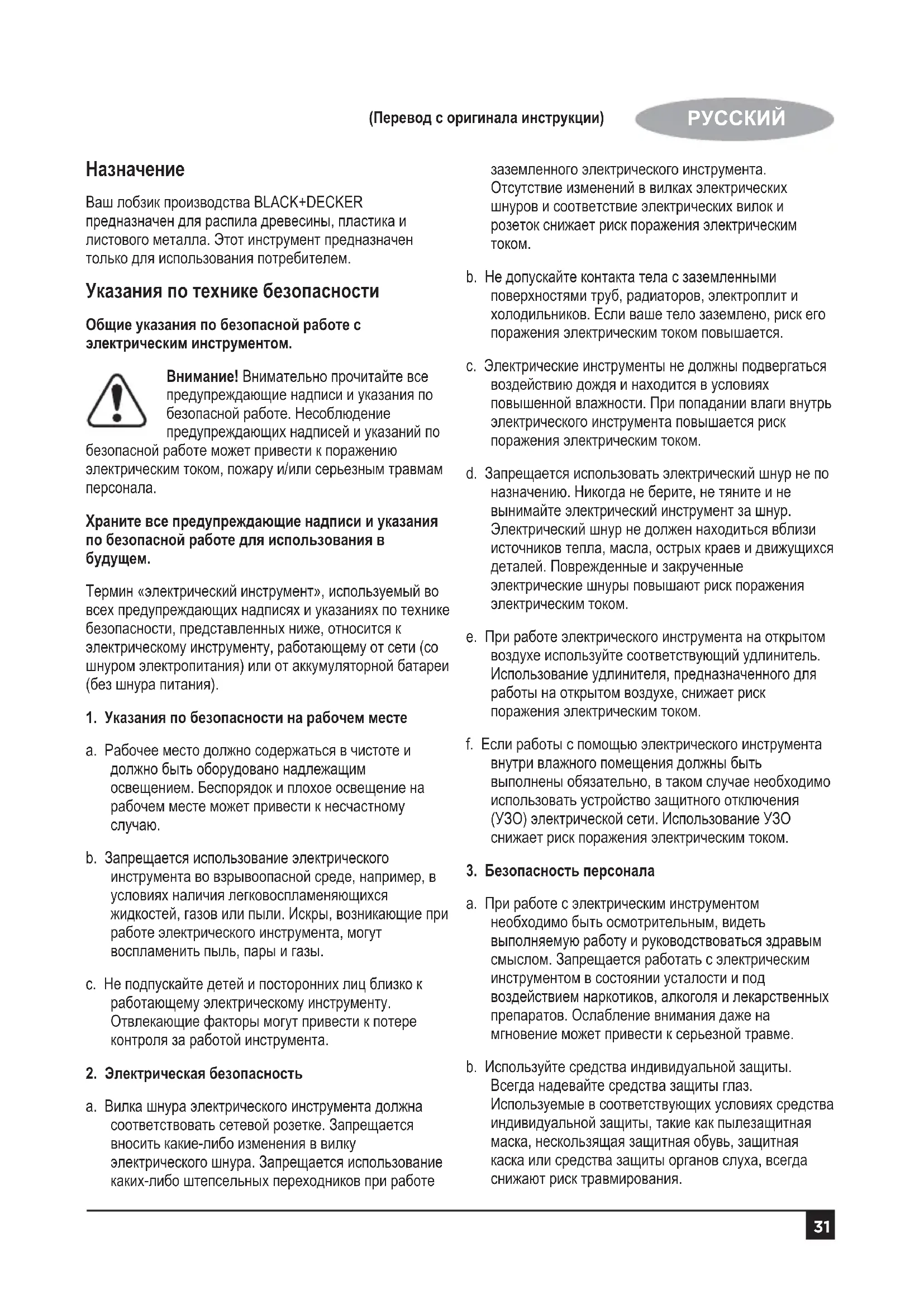 Ваш лобзик производства BLACK+DECKER предназначен для распила древесины, пластика и листового металла. Этот инструмент предназначен только для использования потребителем. Указания по технике безопасности Общие указания по безопасной работе с электрическим инструментом. Внимание! Внимательно прочитайте все предупреждающие надписи и указания по безопасной работе. Несоблюдение предупреждающих надписей и указаний по безопасной работе может привести к поражению электрическим током, пожару и/или серьезным травмам