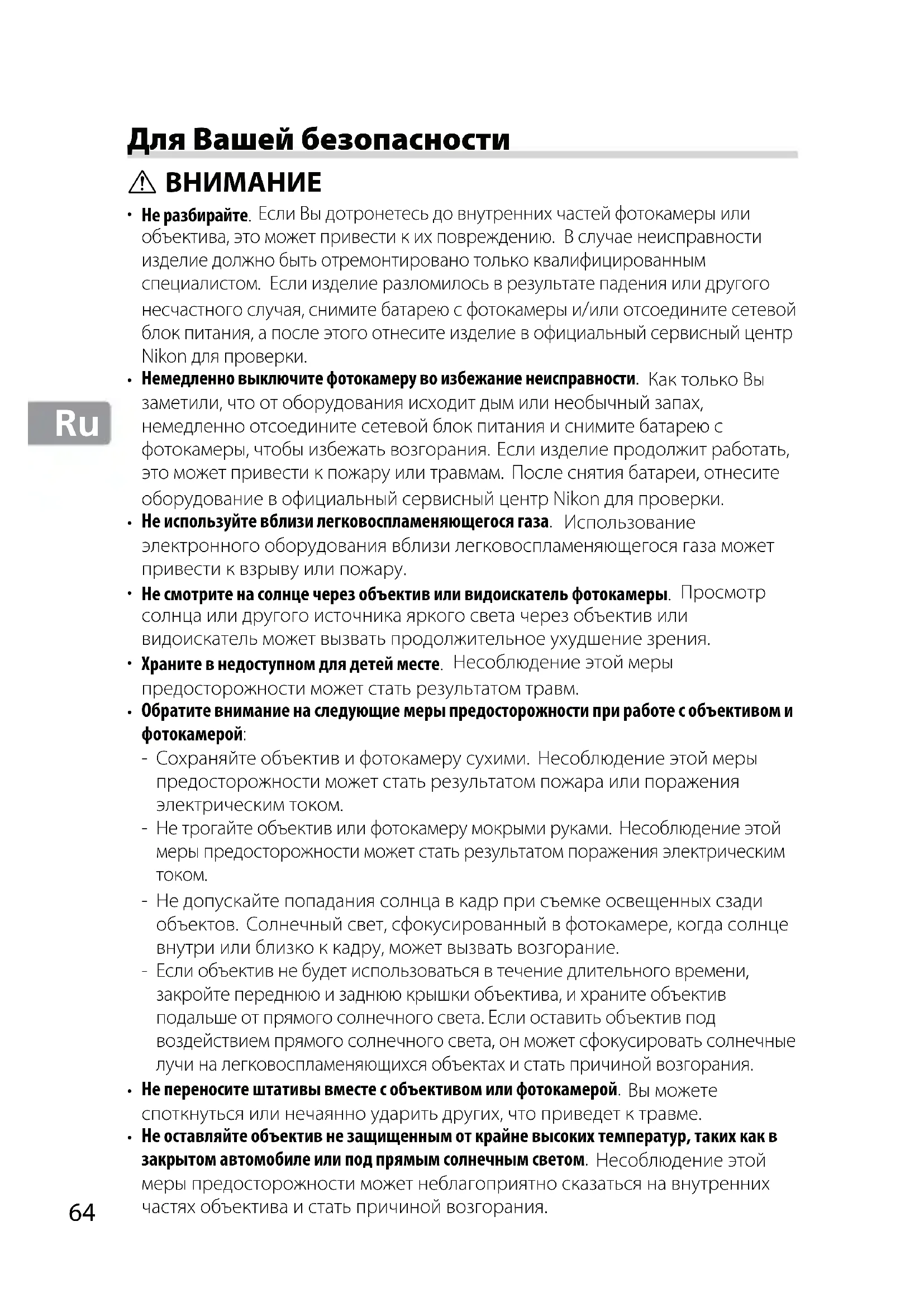 Не разбирайте. Если Вы дотронетесь до внутренних частей фотокамеры или объектива, это может привести к их повреждению. В случае неисправности изделие должно быть отремонтировано только квалифицированным специалистом. Если изделие разломилось в результате падения или другого несчастного случая, снимите батарею с фотокамеры и/или отсоедините сетевой блок питания, а после этого отнесите изделие в официальный сервисный центр Nikon для проверки. Немедленно выключите фотокамеру во избежание неисправности. Как только Вы заметили, что от оборудования исходит дым или необычный запах, немедленно отсоедините сетевой блок питания и снимите батарею с фотокамеры, чтобы избежать возгорания. Если изделие продолжит работать, это может привести к пожару или травмам. После снятия батареи, отнесите оборудование в официальный сервисный центр Nikon для проверки. Не используйте вблизи легковоспламеняющегося газа. Использование электронного оборудования вблизи легковоспламеняющегося газа может привести к взрыву или пожару. Не смотрите на солнце через объектив или видоискатель фотокамеры.