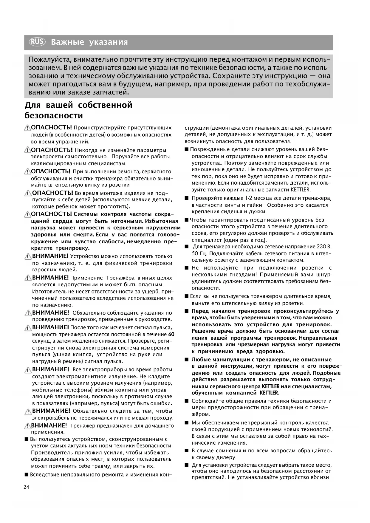■ Обратите внимание, что тренировки нельзя начинать до тех пор, пока монтаж не будет выполнен и проверен надлежащим образом. ■ Тренажер разработан для взрослых, и его ни в коем случае нельзя использовать детям во время игр. Помните, что из-за природной потребности детей в игре и их темперамента часто могут возникать непред- виденные ситуации, ответственность за последствия которых со стороны изготовителя исключена. Но если вы все-таки разрешите ребенку пользоваться трена- жером, обязательно проинструктируйте его и при- сматривайте за ним. ■ Перед первой тренировкой ознакомьтесь со всеми функциями и возможностями настройки устройства. ■ Если во время работы устройства слышен тихий шум, создаваемый маховиком, это никак не влияет на работу устройства. Шумы, появляющиеся при вращении педалей в обратную сторону, обусловлены техниче- скими причинами и также не свидетельствуют о каких- либо неполадках. ■ Тренажёр снабжён магнитной системой торможения. ■ Спортивный тренажер представляет собой устройство, работа которого зависит от частоты вращения педалей. ■ Не допускайте проникновения жидкостей внутрь корпуса или в электронику устройства. Это также касается пота! ■ Перед каждым использованием проверяйте все резь- бовые и штекерные соединения, а также соответ- ствующие предохранительные приспособления на предмет прочности установки. ■ Во время тренировок используйте подходящую обувь (спортивную). ■ Используйте для регулярной очистки, ухода и техни- ческого обслуживания наш комплект изделий для ухода за тренажерами KETTLER (артикульный номер 07921-000). Вы можете приобрести его в специализи- рованном магазине спорттоваров. ■ Отрегулируйте руль и сиденье так, чтобы ваше положение во время тренировки было максимально удобным. ■ Во время тренировки никому нельзя находиться в непосредственной близости от тренирующегося