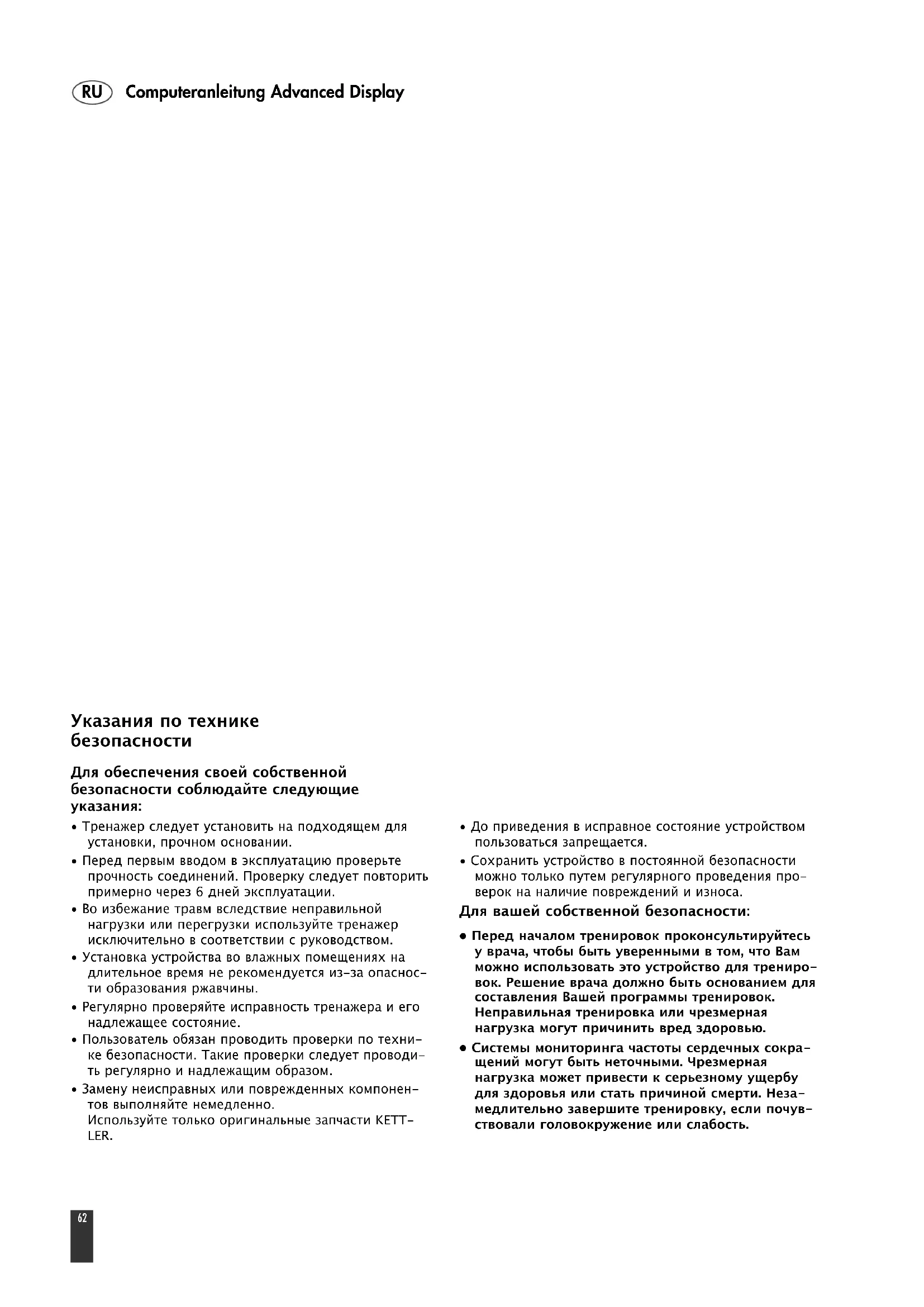 - Перед началом тренировок проконсультируйтесь у врача, чтобы быть уверенными в том, что Вам можно использовать это устройство для трениро- вок. Решение врача должно быть основанием для составления Вашей программы тренировок. Неправильная тренировка или чрезмерная нагрузка могут причинить вред здоровью.