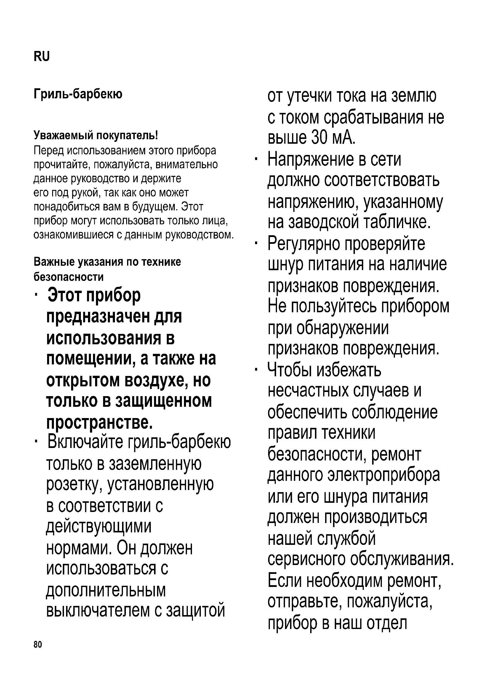 Гриль-барбекю Уважаемый покупатель! Перед использованием этого прибора прочитайте, пожалуйста, внимательно данное руководство и держите его под рукой, так как оно может понадобиться вам в будущем. Этот прибор могут использовать только лица, ознакомившиеся с данным руководством. Важные указания по технике безопасности ∙ Этот прибор предназначен для использования в помещении, а также на открытом воздухе, но только в защищенном пространстве. ∙ Включайте гриль-барбекю только в заземленную розетку, установленную в соответствии с действующими нормами. Он должен использоваться с дополнительным выключателем с защитой от утечки тока на землю с током срабатывания не выше 30 мА