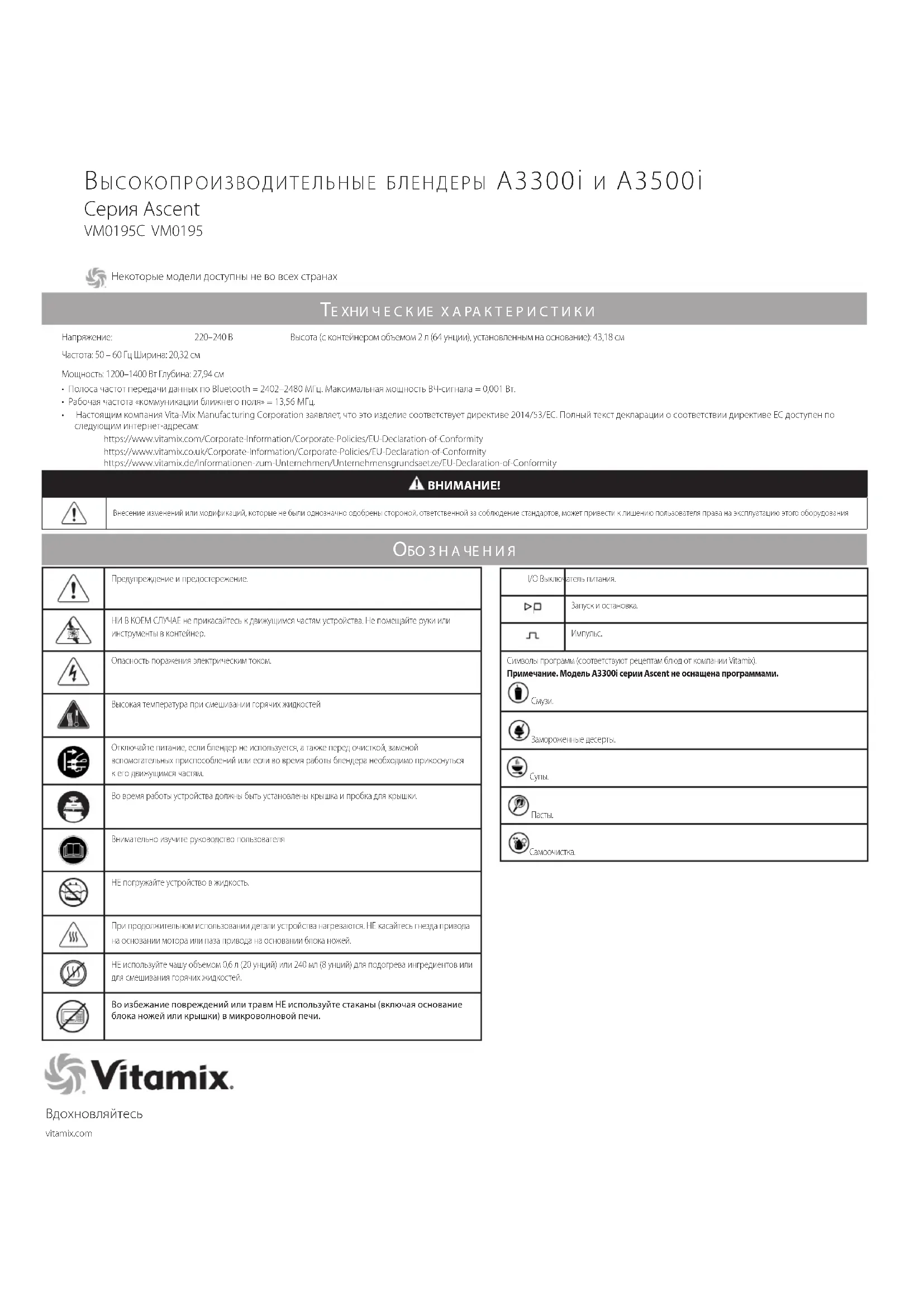 EMIRATER Vitality General Trading LLC PO Box 73265 Dubai De forente arabiske emirater Tlf: +971 (0) 561089662 www.vitality.ae info@vitality.ae 4Homes FZCO PO Box 61379, Dubai UAE. Tlf: +971 4 3807611 Faks: +971 4 387612 4homes@4homes.ae www.tavolashop.com AUSTRALIA OG NEW ZEALAND Vitamix ANZ Pty Limited 167 King St Newcastle NSW2300 Australia Tlf: 1 800 766437 (AUS) Tlf: 050 853 0697 (NZ) www.vitamix.com.au www.vitamix.co.nzВысокопроизВодите льные блендеры A3300i и A3500i Серия Ascent Вдохновляйтесьvitamix.com VM0185 ОбО з н а че н и я Те хни ч е с к ие х а ра к Т е р и с Т и к и Напряжение: 220–240 В Высота (с контейнером объемом 2 л (64 унции), установленным на основание): 43,18 см Частота: 50 – 60 Гц Ширина: 20,32 смМощность: 1200–1400 Вт Глубина: 27,94 смI/O Выключатель питания. Запуск и остановка.Импульс.Символы программ (соответствуют рецептам блюд от компании Vitamix). Примечание. Модель A3300i серии Ascent не оснащена программами. Смузи. Замороженные десерты. Супы. Пасты.Самоочистка. VM0195C VM0195 Некоторые модели доступны не во всех странах• Полоса частот передачи данных по Bluetooth = 2402–2480 МГц. Максимальная мощность ВЧ-сигнала = 0,001 Вт.• Рабочая частота «коммуникации ближнего поля» = 13,56 МГц.