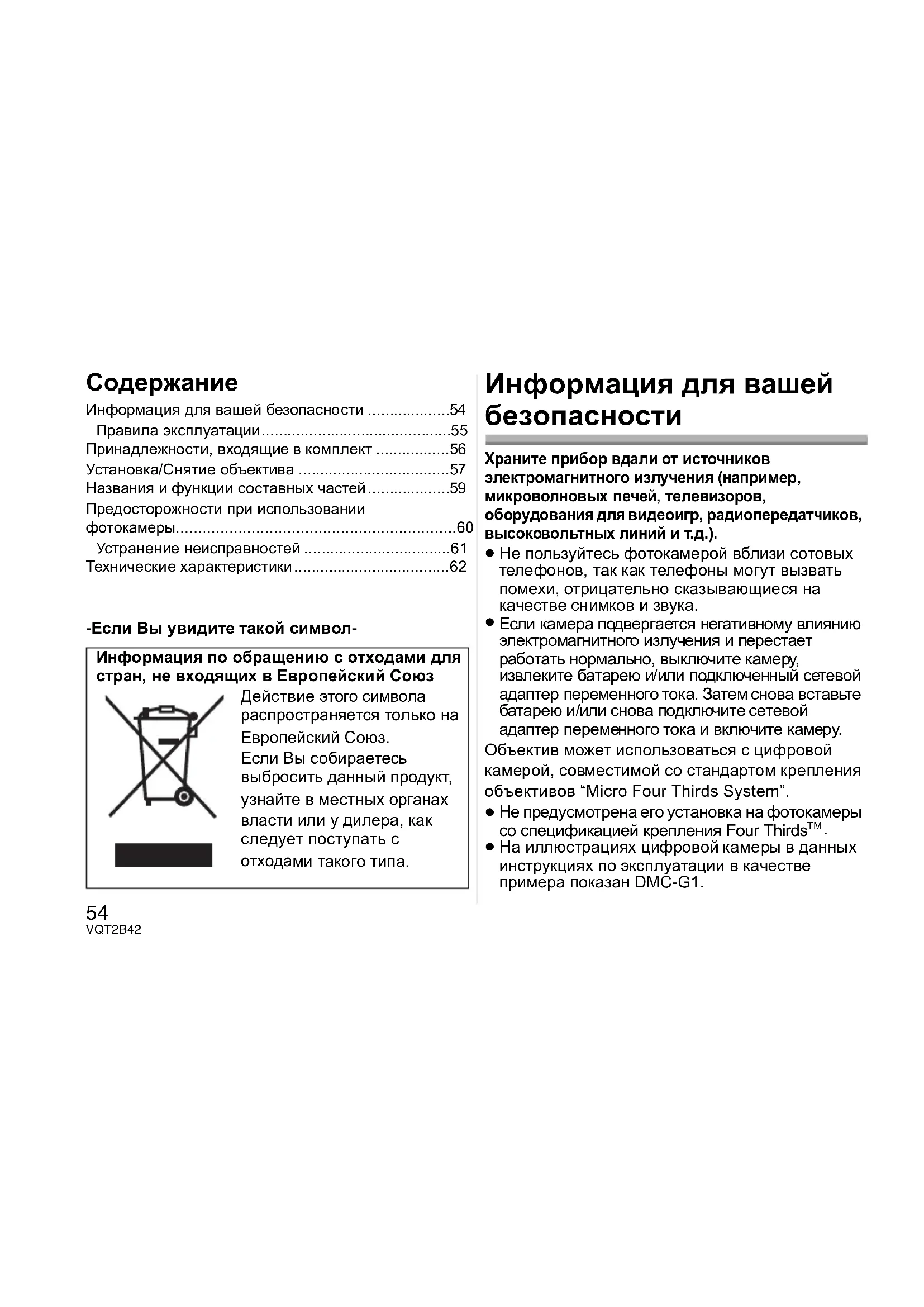 ≥ На иллюстрациях цифровой камеры в данных инструкциях по эксплуатации в качестве примера показан DMC-G1. Информация по обращению с отходами для стран, не входящих в Европейский Союз Действие этого символа распространяется только на Европейский Союз. Если Вы собираетесь выбросить данный продукт, узнайте в местных органах власти или у дилера, как следует поступать с