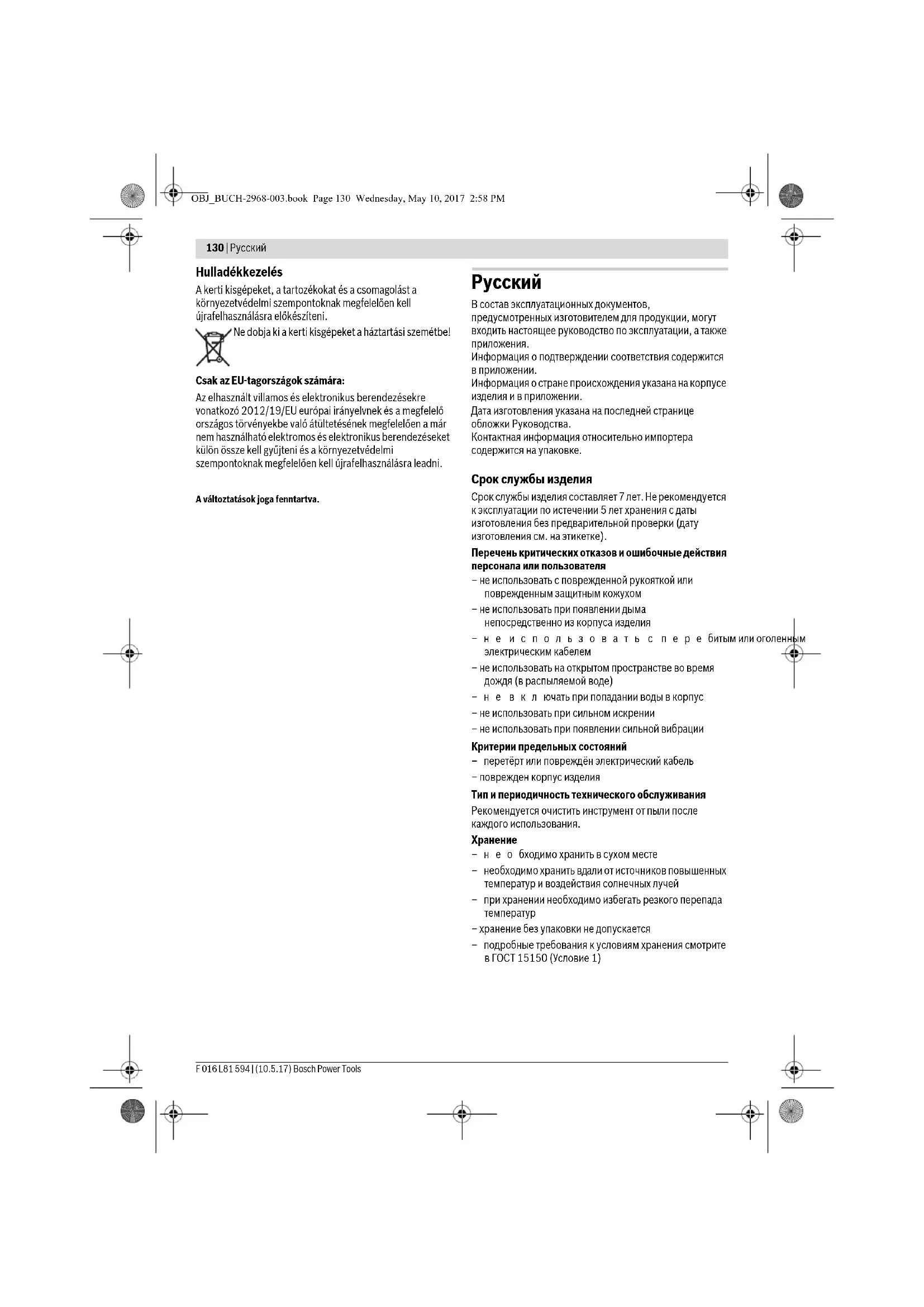 OBJ_BUCH-2968-003.book Page 135 Wednesday, May 10, 2017 2:58 PM136 | Русский F 016 L81 594 | (10.5.17) Bosch Power Tools предписаниям, может исходить опасность. Кабель-удлинитель, вилка и муфта должны быть выполнены в водонепроницаемом исполнении и допущены для использования под открытым