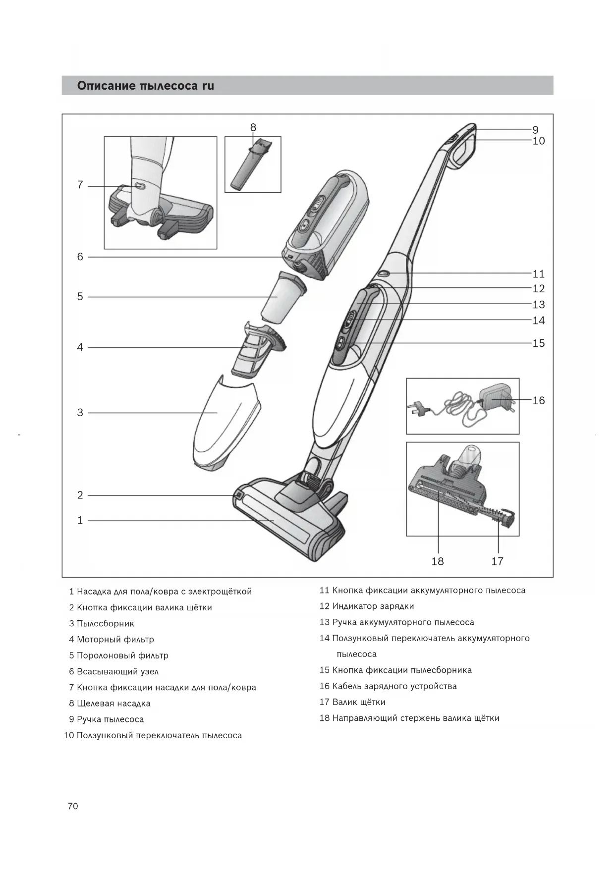 bg70 Описание пылесоса ru 1 Насадка для пола/ковра с электрощёткой 2 Кнопка фиксации валика щётки 3 Пылесборник 4 Моторный фильтр 5 Поролоновый фильтр 6 Всасывающий узел 7 Кнопка фиксации насадки для пола/ковра 8 Щелевая насадка 9 Ручка пылесоса 10 Ползунковый переключатель пылесоса 11 Кнопка фиксации аккумуляторного пылесоса 12 Индикатор зарядки 13 Ручка аккумуляторного пылесоса 14 Ползунковый переключатель аккумуляторного