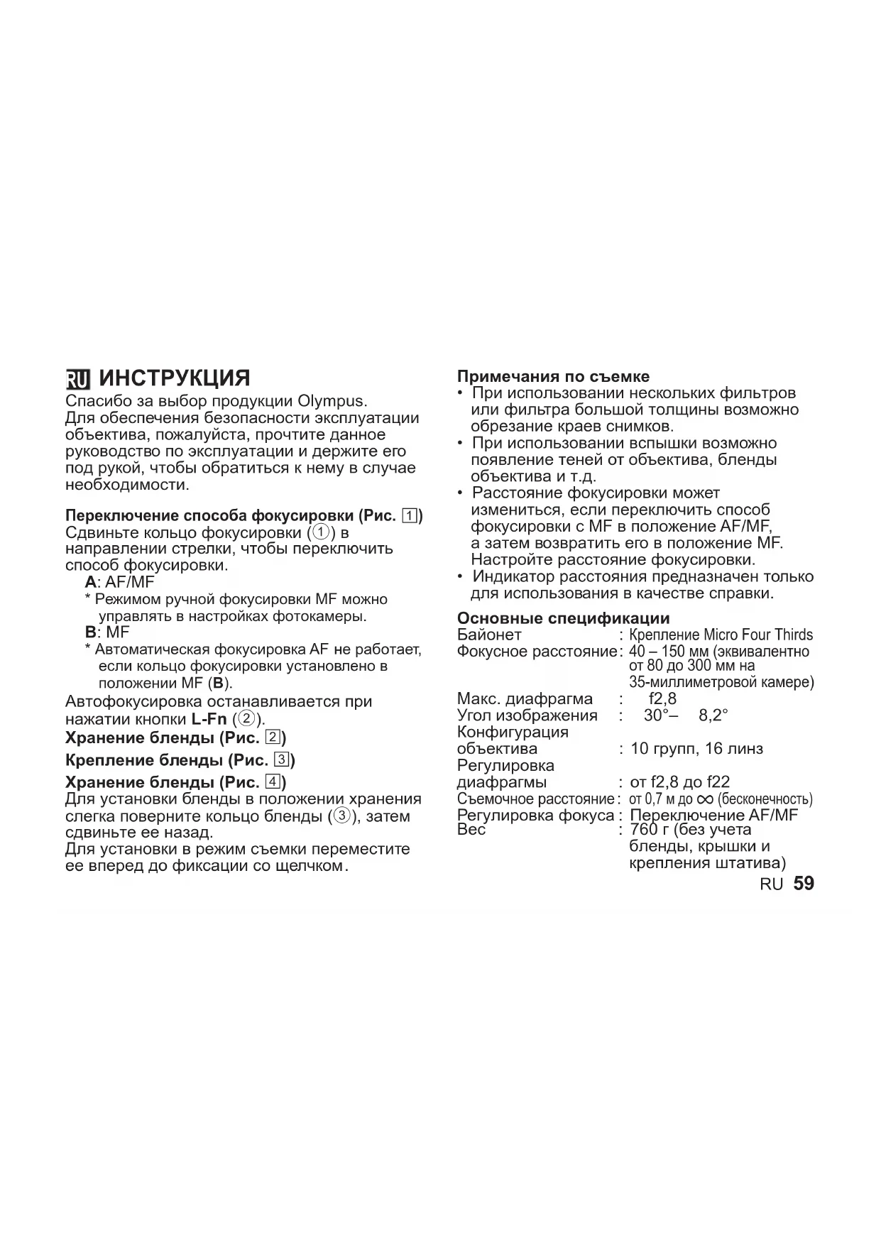 Спасибо за выбор продукции Olympus. Для обеспечения безопасности эксплуатации объектива, пожалуйста, прочтите данное руководство по эксплуатации и держите его под рукой, чтобы обратиться к нему в случае необходимости. Переключение способа фокусировки (Рис.