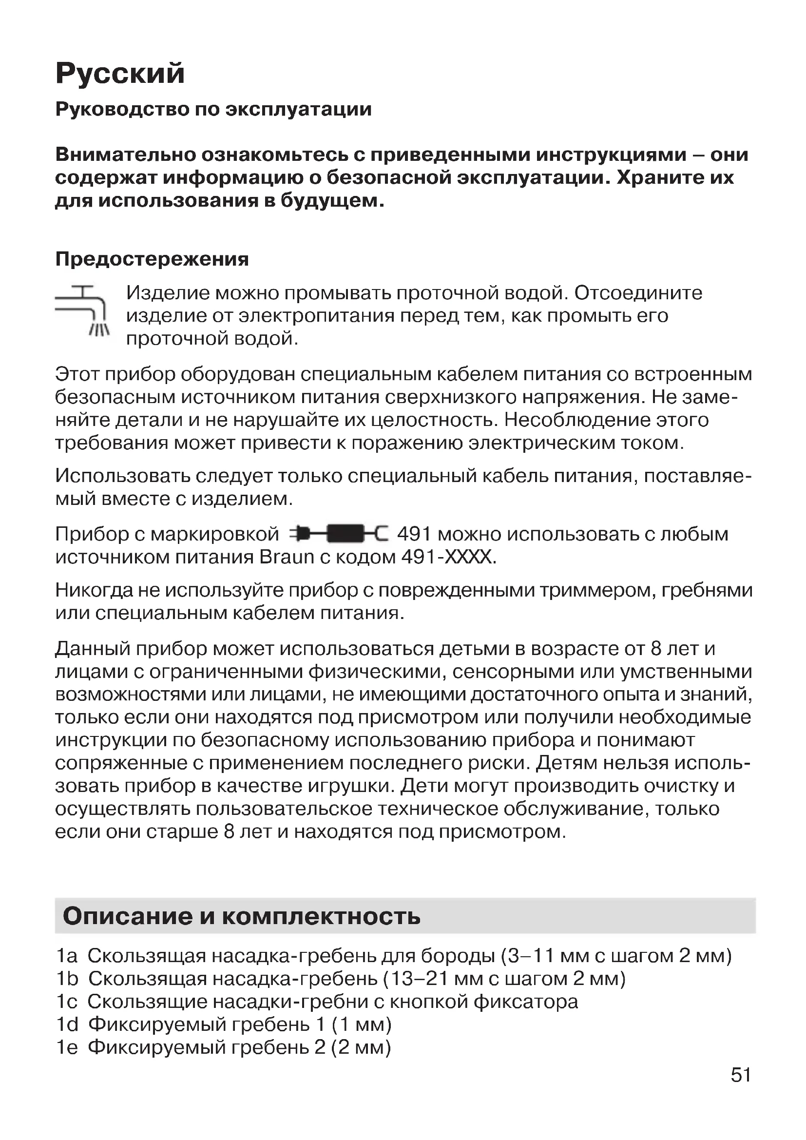 Руководство по эксплуатации Внимательно ознакомьтесь с приведенными инструкциями – они содержат информацию о безопасной эксплуатации. Храните их для использования в будущем. Предостережения Изделие можно промывать проточной водой. Отсоедините изделие от электропитания перед тем, как промыть его проточной водой. Этот прибор оборудован специальным кабелем питания со встроенным безопасным источником питания сверхнизкого напряжения. Не заме- няйте детали и не нарушайте их целостность. Несоблюдение этого требования может привести к поражению электрическим током. Использовать следует только специальный кабель питания, поставляе- мый вместе с изделием. Прибор с маркировкой 491 можно использовать с любым источником питания Braun с кодом 491-XXXX. Никогда не используйте прибор с поврежденными триммером, гребнями или специальным кабелем питания. Данный прибор может использоваться детьми в возрасте от 8 лет и лицами с ограниченными физическими, сенсорными или умственными возможностями или лицами, не имеющими достаточного опыта и знаний, только если они находятся под присмотром или получили необходимые инструкции по безопасному использованию прибора и понимают сопряженные с применением последнего риски. Детям нельзя исполь- зовать прибор в качестве игрушки. Дети могут производить очистку и осуществлять пользовательское техническое обслуживание, только если они старше 8 лет и находятся под присмотром. Описание и комплектность 1а Скользящая насадка-гребень для бороды (3–11 мм с шагом 2 мм) 1b Скользящая насадка-гребень (13–21 мм с шагом 2 мм) 1c Скользящие насадки-гребни с кнопкой фиксатора 1d Фиксируемый гребень 1 (1 мм) 1е Фиксируемый гребень 2 (2 мм) 91390847_MGK_3040-3045-3060_CEEMEA.indd 5191390847_MGK_3040-3045-3060_CEEMEA.indd 51 20.03.17 11:1320.03.17 11:13 CSS APPROVED Effective Date 24Mar2017 GMT - Printed 05Apr2017 Page 51 of 6852 2а Головка-триммер 2b Головка-триммер для ушей и носа (только MGK 3060) 2c Головка для точной стрижки 3 Кнопка включения/выключения 4 Индикатор зарядки 5 Разъем питания 6 Специальный кабель питания (внешний вид может отличаться) Электрические характеристики указаны в маркировке кабеля питания.