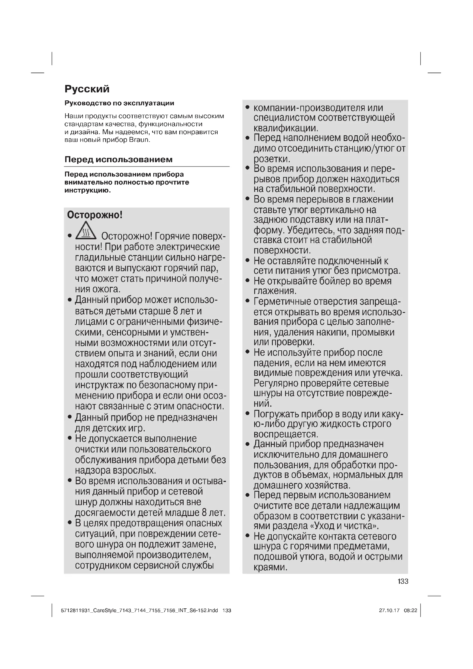Осторожно! Горячие поверх- ности! При работе электрические гладильные станции сильно нагре- ваются и выпускают горячий пар, что может стать причиной получе-