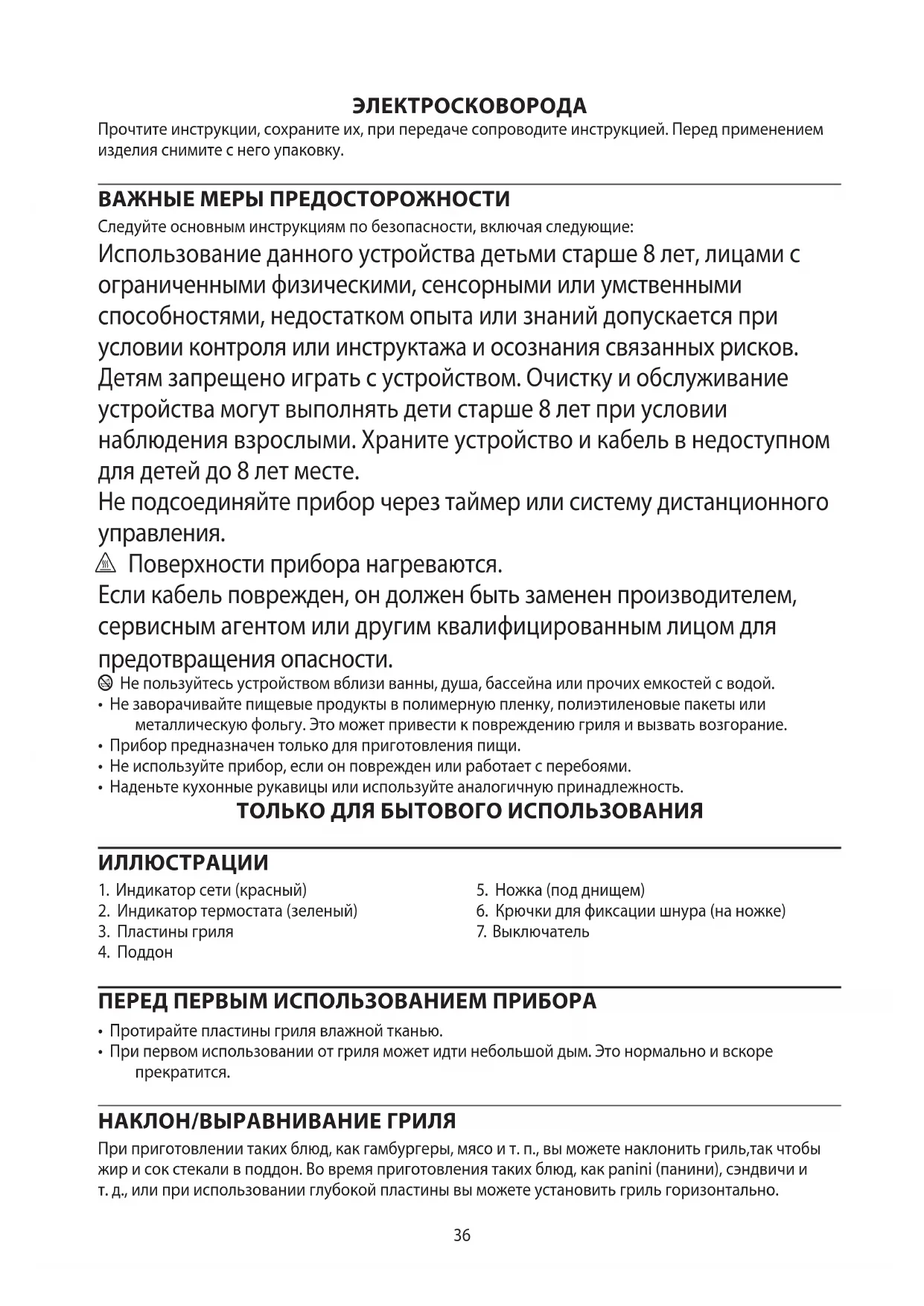 AE36 ЭЛЕКТРОСКОВОРОДА Прочтите инструкции, сохраните их, при передаче сопроводите инструкцией. Перед применением изделия снимите с него упаковку. ВАЖНЫЕ МЕРЫ ПРЕДОСТОРОЖНОСТИ Следуйте основным инструкциям по безопасности, включая следующие: Использование данного устройства детьми старше 8 лет, лицами с ограниченными физическими, сенсорными или умственными способностями, недостатком опыта или знаний допускается при условии контроля или инструктажа и осознания связанных рисков. Детям запрещено играть с устройством. Очистку и обслуживание устройства могут выполнять дети старше 8 лет при условии наблюдения взрослыми. Храните устройство и кабель в недоступном для детей до 8 лет месте. Не подсоединяйте прибор через таймер или систему дистанционного управления. ¬ Поверхности прибора нагреваются. Если кабель поврежден, он должен быть заменен производителем, сервисным агентом или другим квалифицированным лицом для предотвращения опасности. b Не пользуйтесь устройством вблизи ванны, душа, бассейна или прочих емкостей с водой.