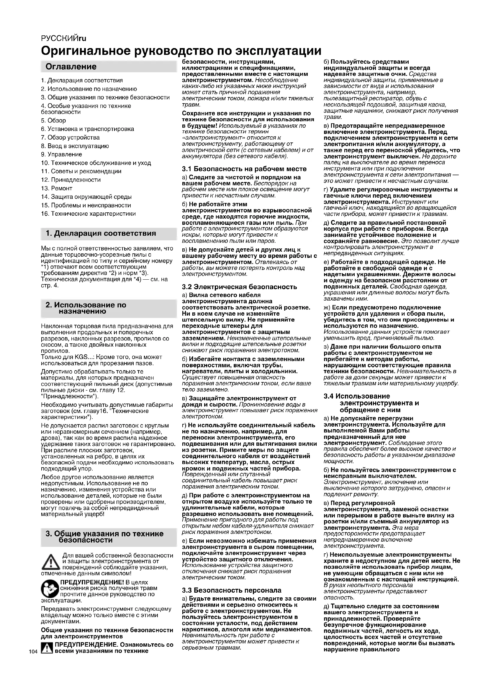 Только для KGS...: Кроме того, она может использоваться для прорезания пазов. Допустимо обрабатывать только те материалы, для которых предназначен соответствующий пильный диск (допустимые пильные диски - см. главу 12. "Принадлежности"). Необходимо учитывать допустимые габариты заготовок (см. главу16. "Технические характеристики"). Не допускается распил заготовок с круглым или неравномерным сечением (например, дрова), так как во время распила надежное удержание таких заготовок не гарантировано. При распиле плоских заготовок, установленных на ребро, в целях их безопасной подачи необходимо использовать подходящий упор. Любое другое использование является недопустимым. Использование не по назначению, изменения устройства или использование деталей, которые не были проверены или одобрены производителем, могут повлечь за собой непредвиденный материальный ущерб! Для вашей собственной безопасности и защиты электроинструмента от повреждений соблюдайте указания, отмеченные данным символом! ПРЕДУПРЕЖДЕНИЕ! В целях снижения риска получения травм прочтите данное руководство по эксплуатации. Передавать электроинструмент следующему владельцу можно только вместе с этими документами. Общие указания по технике безопасности для электроинструментов ПРЕДУПРЕЖДЕНИЕ. Ознакомьтесь со всеми указаниями по технике безопасности, инструкциями, иллюстрациями и спецификациями, предоставленными вместе с настоящим электроинструментом. Несоблюдение каких-либо из указанных ниже инструкций может стать причиной поражения электрическим током, пожара и/или тяжелых