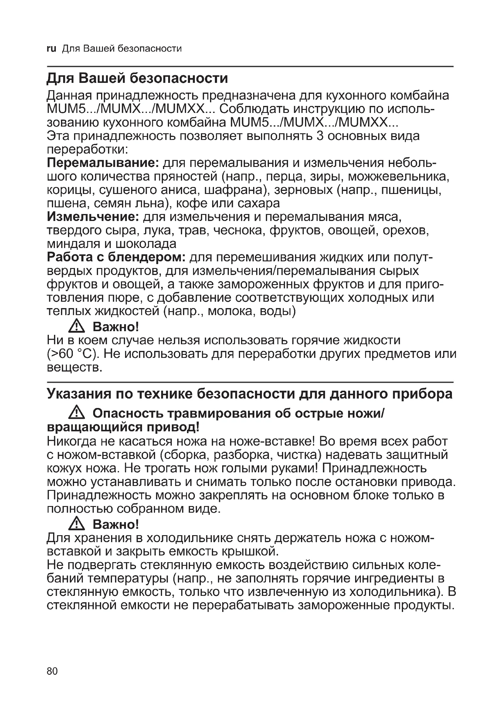 ■ Збивати в блендерi 40 секунд на ступені «M». Зелений смузі* – 1 зелене яблуко (прибл. 100 г) – сік одного лимона (прибл. 20 г) – 20 г кучерявої капусти (грюнколь) – 10 г стебла селери – 10 г листя коріандру – 10 г насіння льону – 1 г меленої кориці – 250 г охолодженої води Hасадка: Насадкаблендер і ніжвставка з ножем блендера/ножем для подрібнення (червоний ущільнювач) ■ Яблуко почистити і нарізати шматочками. ■ Стебло селери нарізати шматочками. ■ Збивати в блендерi 60 секунд на ступені «M». Ми залишаємо за собою право на внесення змін.80 ru Для Вашей безопасности Для Вашей безопасности Данная принадлежность предназначена для кухонного комбайна MUM5.../MUMX.../MUMXX... Соблюдать инструкцию по исполь зованию кухонного комбайна MUM5.../MUMX.../MUMXX... Эта принадлежность позволяет выполнять 3 основных вида переработки: Перемалывание: для перемалывания и измельчения неболь шого количества пряностей (напр., перца, зиры, можжевельника, корицы, сушеного аниса, шафрана), зерновых (напр., пшеницы, пшена, семян льна), кофе или сахара Измельчение: для измельчения и перемалывания мяса, твердого сыра, лука, трав, чеснока, фруктов, овощей, орехов, миндаля и шоколада Работа с блендером: для перемешивания жидких или полут вердых продуктов, для измельчения/перемалывания сырых фруктов и овощей, а также замороженных фруктов и для приго товления пюре, с добавление соответствующих холодных или теплых жидкостей (напр., молока, воды) W Важно! Ни в коем случае нельзя использовать горячие жидкости (>60 °C). Hе использовать для переработки других предметов или