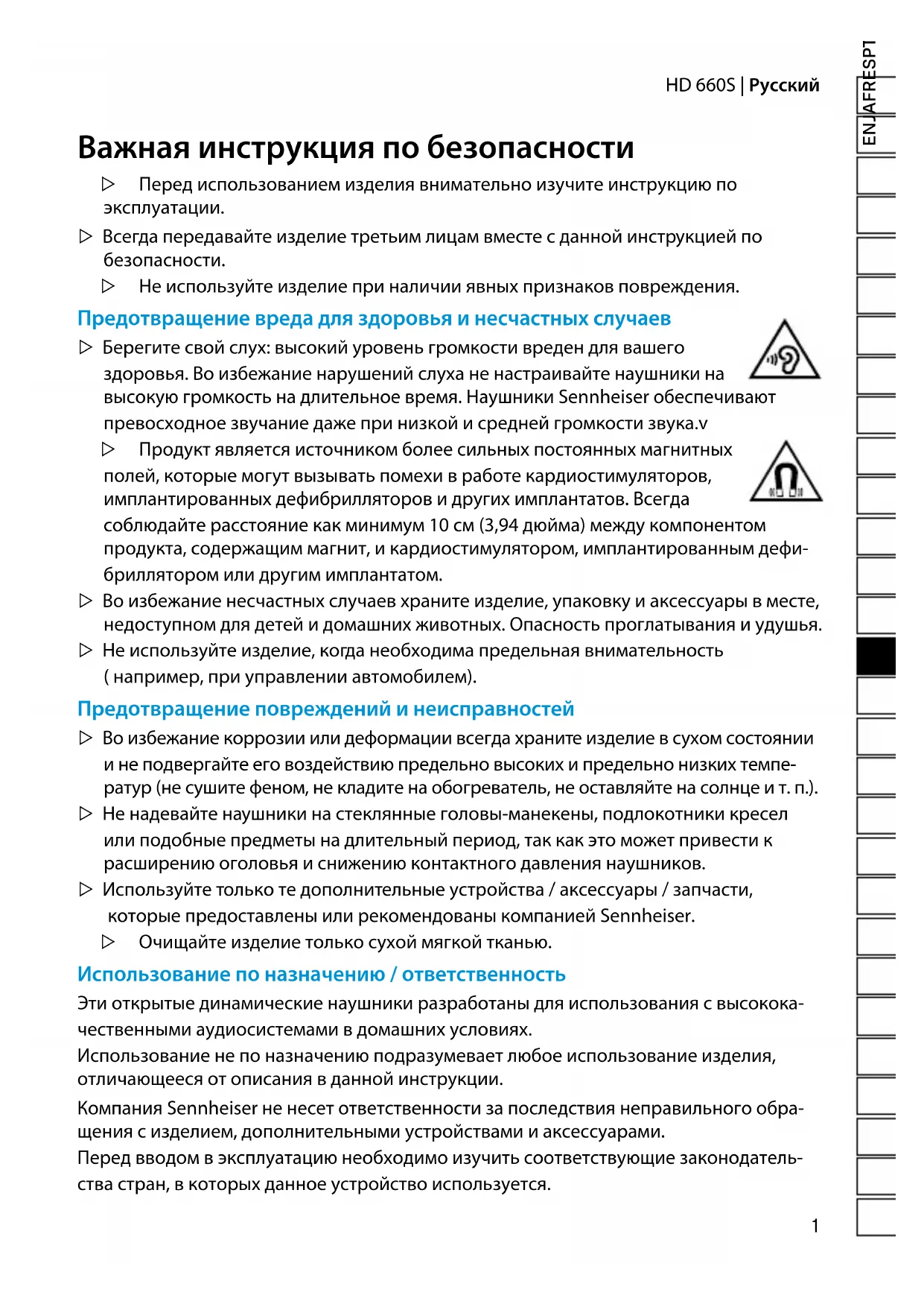 - WEEE Yönergesi (2012/19/AB) Ürün, pil/akü (uygulanabilir ise) ve/veya ambalajda üzerine çapraz çizgi çekilen tekerlekli çöp kutusu simgesi, bu ürünlerin kullanım ömürleri sonunda normal ev atığı üzerinden bertaraf edilmemesi, fakat ayrı bir toplama kuruluşuna iletilmesi gerektiğini bildirir. Ambalajlar için lütfen ülkenizdeki atık ayırma ile ilgili yasal talimatlara uyun. Bu ürünlerin geri dönüşümü için ek bilgiyi belediye yönetiminizde, yerel toplama veya geri alma merkezlerinde ya da Sennheiser bayinizden alabilirsiniz. Eski elektrik ve elektronik cihazların, piller/akülerin (uygulanabilir ise) ve ambalaj- ların ayrı olarak toplanması, geri kazanımı ve/veya değerlendirmeyi teşvik etmek ve örneğin potansiyel olarak içerilen zararlı maddelerden kaynaklanan olumsuz etkileri önlemek için işlev görmektedir. Bu suretle çevremizin ve insan sağlığının korunması için önemli bir katkıda bulunabilirsiniz.1 HD 660S | Русский ENJAFRESPTNLITDASVFIELPLTRRUZHTWKOIDEELVLTCSSKHUROBGSLHR DE Важная инструкция по безопасности ▷ Перед использованием изделия внимательно изучите инструкцию по эксплуатации. ▷ Всегда передавайте изделие третьим лицам вместе с данной инструкцией по безопасности. ▷ Не используйте изделие при наличии явных признаков повреждения. Предотвращение вреда для здоровья и несчастных случаев ▷ Берегите свой слух: высокий уровень громкости вреден для вашего здоровья. Во избежание нарушений слуха не настраивайте наушники на высокую громкость на длительное время. Наушники Sennheiser обеспечивают превосходное звучание даже при низкой и средней громкости звука.v ▷ Продукт является источником более сильных постоянных магнитных полей, которые могут вызывать помехи в работе кардиостимуляторов, имплантированных дефибрилляторов и других имплантатов. Всегда соблюдайте расстояние как минимум 10 см (3,94 дюйма) между компонентом продукта, содержащим магнит, и кардиостимулятором, имплантированным дефи- бриллятором или другим имплантатом. ▷ Во избежание несчастных случаев храните изделие, упаковку и аксессуары в месте, недоступном для детей и домашних животных. Опасность проглатывания и удушья. ▷ Не используйте изделие, когда необходима предельная внимательность ( например, при управлении автомобилем). Предотвращение повреждений и неисправностей ▷ Во избежание коррозии или деформации всегда храните изделие в сухом состоянии и не подвергайте его воздействию предельно высоких и предельно низких темпе- ратур (не сушите феном, не кладите на обогреватель, не оставляйте на солнце ит.п.). ▷ Не надевайте наушники на стеклянные головы-манекены, подлокотники кресел или подобные предметы на длительный период, так как это может привести к расширению оголовья и снижению контактного давления наушников. ▷ Используйте только те дополнительные устройства/ аксессуары/ запчасти, которые предоставлены или рекомендованы компанией Sennheiser. ▷ Очищайте изделие только сухой мягкой тканью. Использование по назначению/ ответственность Эти открытые динамические наушники разработаны для использования с высокока- чественными аудиосистемами в домашних условиях. Использование не по назначению подразумевает любое использование изделия, отличающееся от описания в данной инструкции. Компания Sennheiser не несет ответственности за последствия неправильного обра- щения с изделием, дополнительными устройствами и аксессуарами. Перед вводом в эксплуатацию необходимо изучить соответствующие законодатель- ства стран, в которых данное устройство используется. RU Инструкция по эксплуатации2 Русский | HD 660S Комплект поставки 1шт. открытые динамические наушники HD660S 1шт. соединительный кабель со штекером типа «джек» 6,35мм (подсоединен изначально), асимметричный 1шт. 