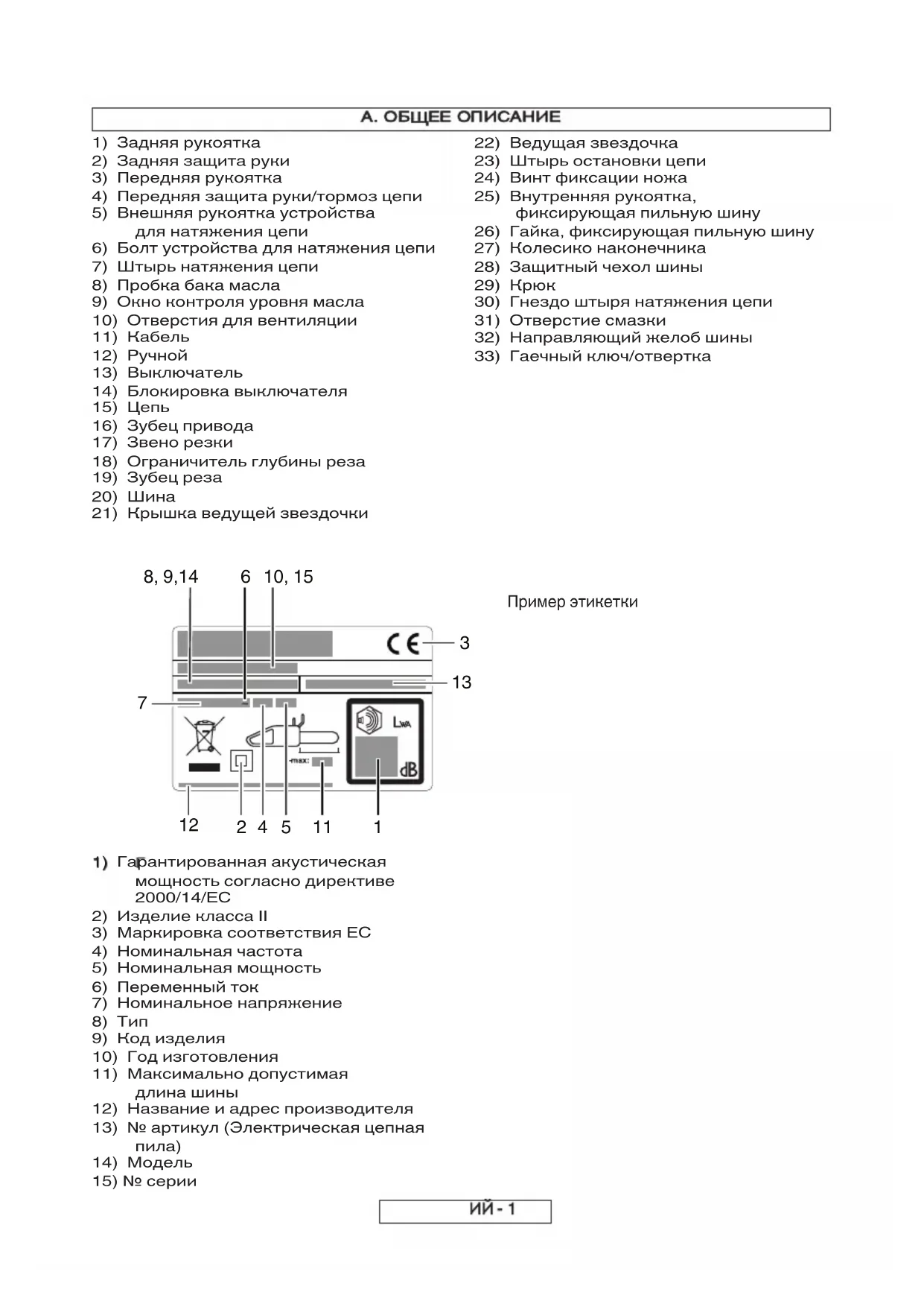 Не бросать не работающую машину в окружающей среде, а сдавать на свалку в уполномоченные для сбора отходов организации, согласно действующему законодательству. Символ на изделии или на упаковке показывает, что это изделие нельзя выбрасывать вместе с бытовым мусором. Вместо этого оно должно быть отнесено на подходящий сборный пункт для утилизации электрического и электронного оборудования. Обеспечив, чтобы это изделие было выброшено правильным образом, Вы поможете предотвратить потенциальные негативные последствия для окружающей среды и здоровья людей, что могло бы случиться при неправильном обращении с этим изделием, выброшенным в бытовой мусор. Для более подробной информации об утилизации этого изделия, пожалуйста, свяжитесь с офисом Вашего местного совета, службой удаления бытового мусора или с магазином, где Вы приобрели это изделие. J. ТАБЛИЦА ПОИСКА НЕИСПРАВНОСТЕЙ Двигатель Двигатель Машина Двигатель Тормозящие не вращается включается, ‚вращается с įустройства включается плохо и но режет аномалиями блокируют теряет неправильно greičiu вращение цепи мощность неправильно Проверить наличие тока в сети питания Проверить, что вилка вставлена