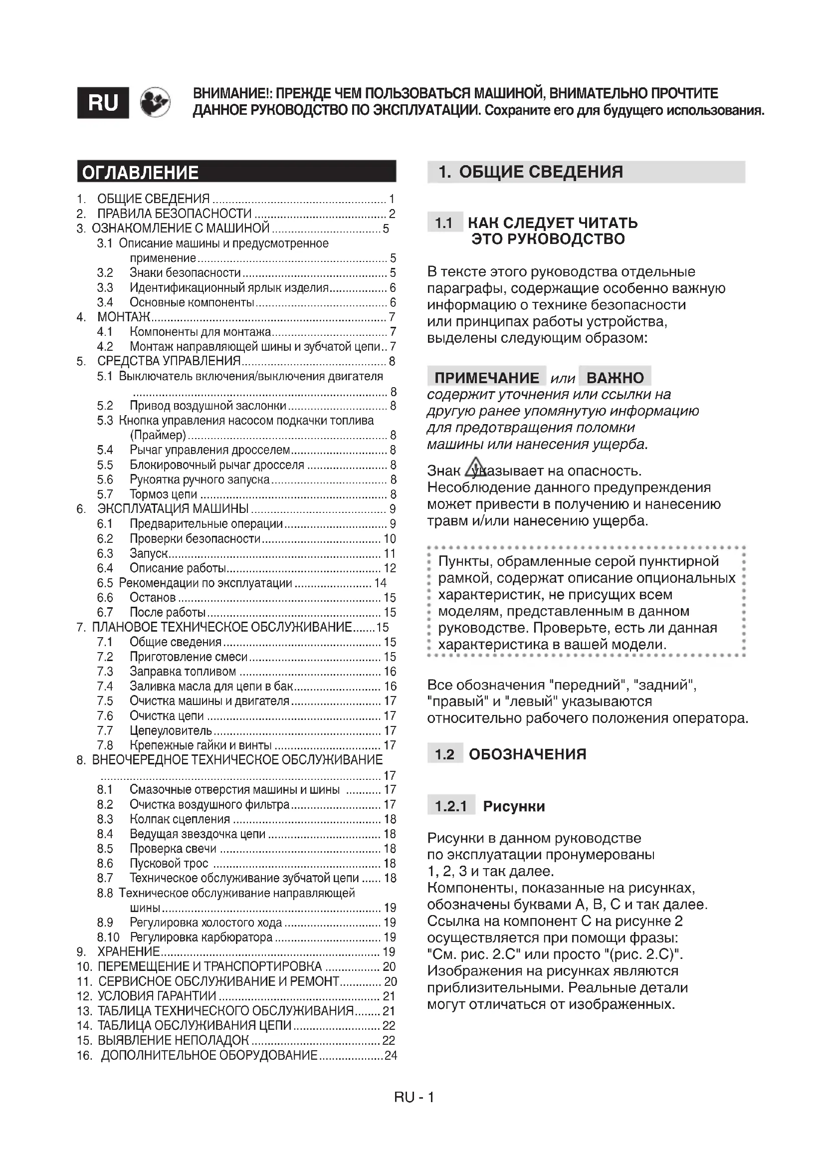 ЭТО РУКОВОДСТВО В тексте этого руководства отдельные параграфы, содержащие особенно важную информацию о технике безопасности или принципах работы устройства, выделены следующим образом: ПРИМЕЧАНИЕ или ВАЖНО содержит уточнения или ссылки на другую ранее упомянутую информацию для предотвращения поломки машины или нанесения ущерба. Знак указывает на опасность. Несоблюдение данного предупреждения может привести в получению и нанесению травм и/или нанесению ущерба. Пункты, обрамленные серой пунктирной рамкой, содержат описание опциональных характеристик, не присущих всем моделям, представленным в данном руководстве. Проверьте, есть ли данная характеристика в вашей модели. Все обозначения "передний", "задний", "правый" и "левый" указываются относительно рабочего положения оператора.